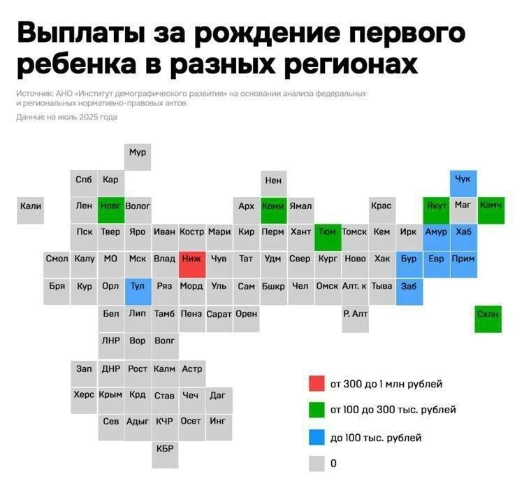 Из инфографики АНО «Институт демографического развития» (данные на июль 2025 года) следует, что за рождение первого ребенка дополнительные деньги семьям сейчас выплачивают лишь в 15 российских регионах. При этом суммы выплат существенно варьируются.