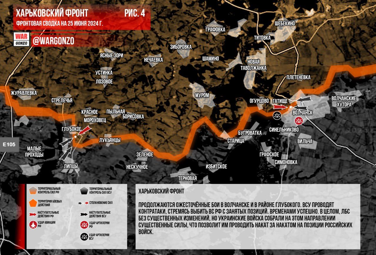 Харьковский фронт. Продолжаются ожесточённые бои в Волчанске и в районе Глубокого. ВСУ проводят контратаки, стремясь выбить ВС РФ с занятых позиций. Временами успешно. В целом, ЛБС без существенных изменений, но украинские войска собрали на этом направлении существенные силы, что позволит им проводить накат за накатом на позиции российских войск. (Рис. 4)