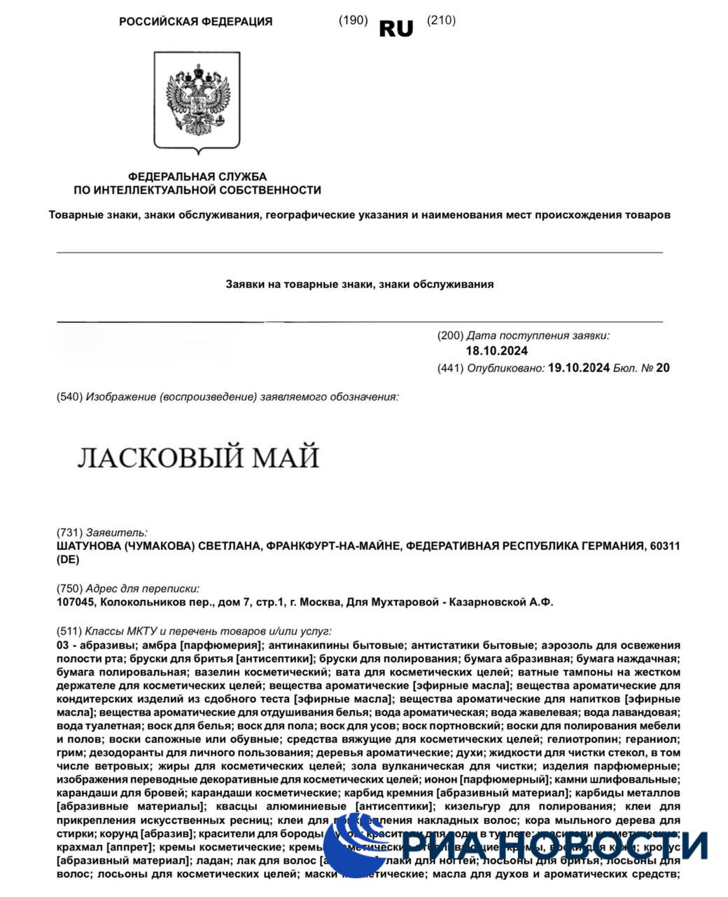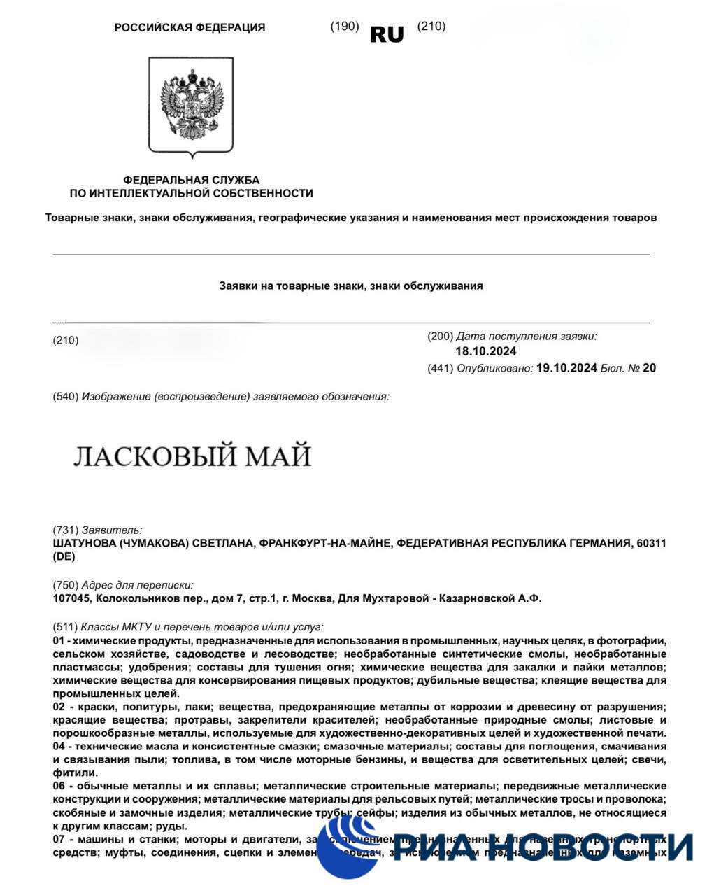 Вдова Юрия Шатунова подала в Роспатент две заявки на регистрацию товарного знака "Ласковый май", выяснило РИА Новости.