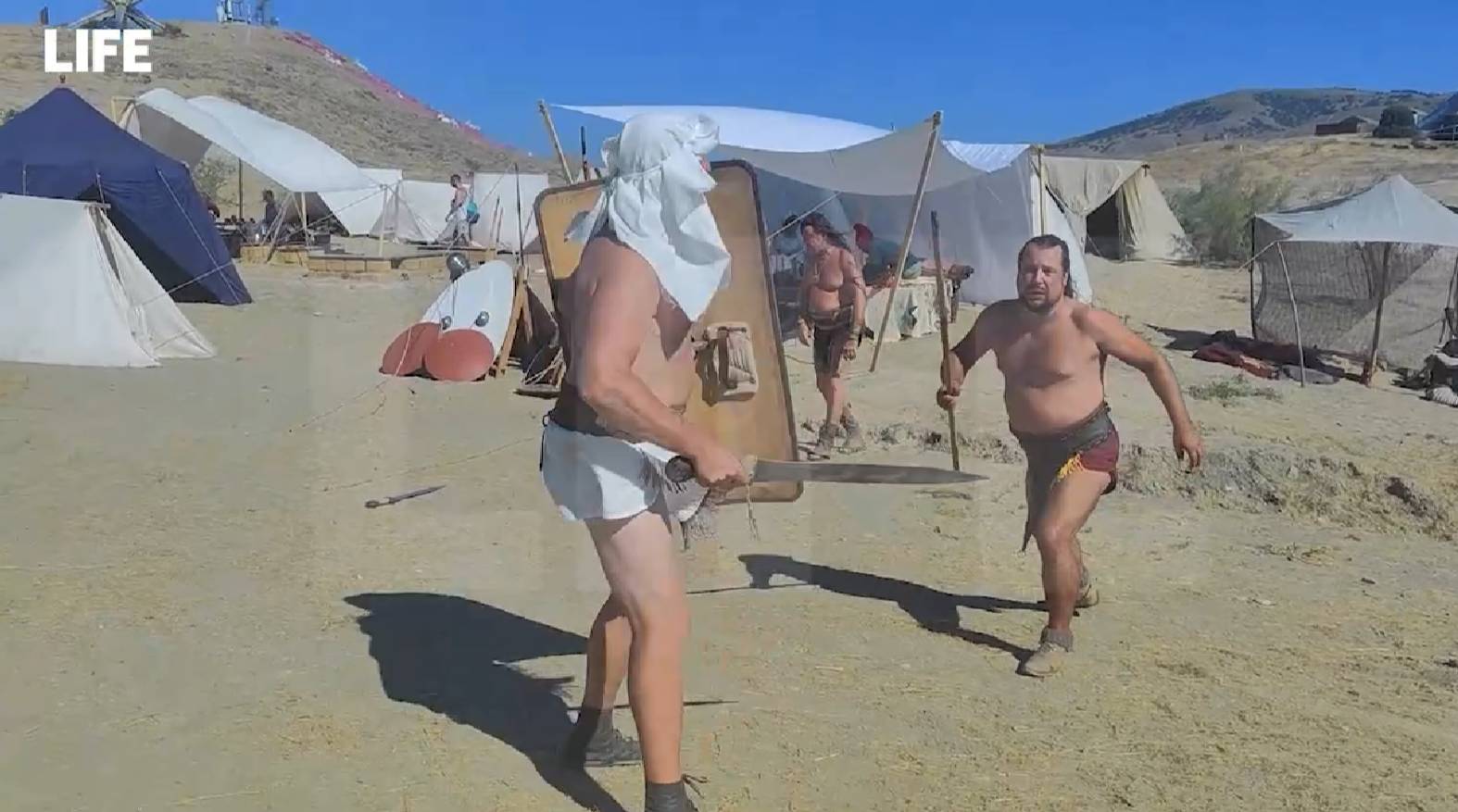 На фестивале "Таврида-АРТ" в Крыму кипит жизнь: одно действо сменяется другим. Так, например, корреспондент Лайфа стал свидетелем того, как реконструкторы-каскадёры воссоздают военные сборы гладиаторов, скифов и римских легионеров, а гусляры-реконструкторы исполняют народные песни.