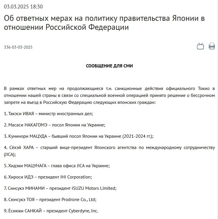 Москва в рамках ответных мер бессрочно запретила въезд в страну девяти гражданам Японии, включая министра иностранных дел Такэси Ивая.