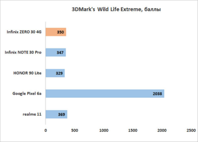 Впрочем, «простоватая» аппаратная платформа не делает смартфон отстающим в своем классе — по факту серьезно впереди тут только Google Pixel 6a с его фирменной платформой Tensor первого поколения. Также чуть в отрыве те самые NOTE 30 VIP и GT 10 Pro с платформой Helio 8050. В остальном, как можно увидеть на графиках ниже, все более-менее ровненько. И не сказал бы, что слабенько. Да, какого-то явного запаса на многие годы вперед Helio G99 не дает, но прямо сейчас обеспечивает шуструю работу системы и возможность запускать любые игры — при условии, что вы не гонитесь за высокой кадровой частотой.