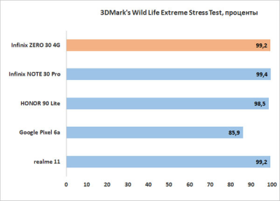 Важное достоинство заслуженной платформы Helio G99 – умеренное тепловыделение. Смартфоны с ней на борту практически никогда не перегреваются и не троттлят. Infinix ZERO 30 4G – не исключение. Сколько-нибудь значимого троттлинга в ресурсных тестах не выявлено, смартфон под нагрузкой греется минимально.