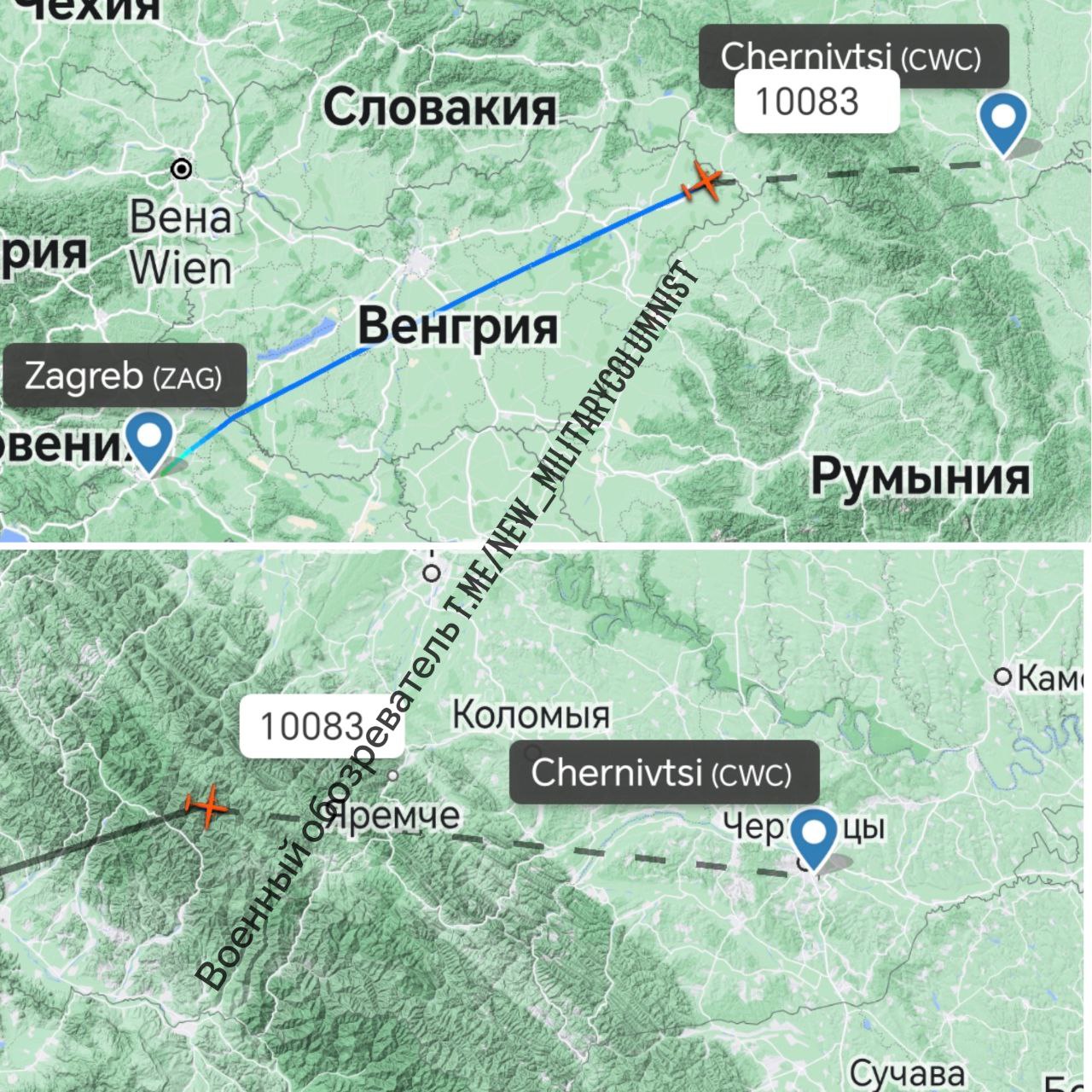 Транспортный самолёт Ан-32П Государственной службы по чрезвычайным ситуациям Украины в эти минуты совершает полёт из хорватского Загреба... в воздушном пространстве Украины. Груз неизвестен, вероятно оружие.