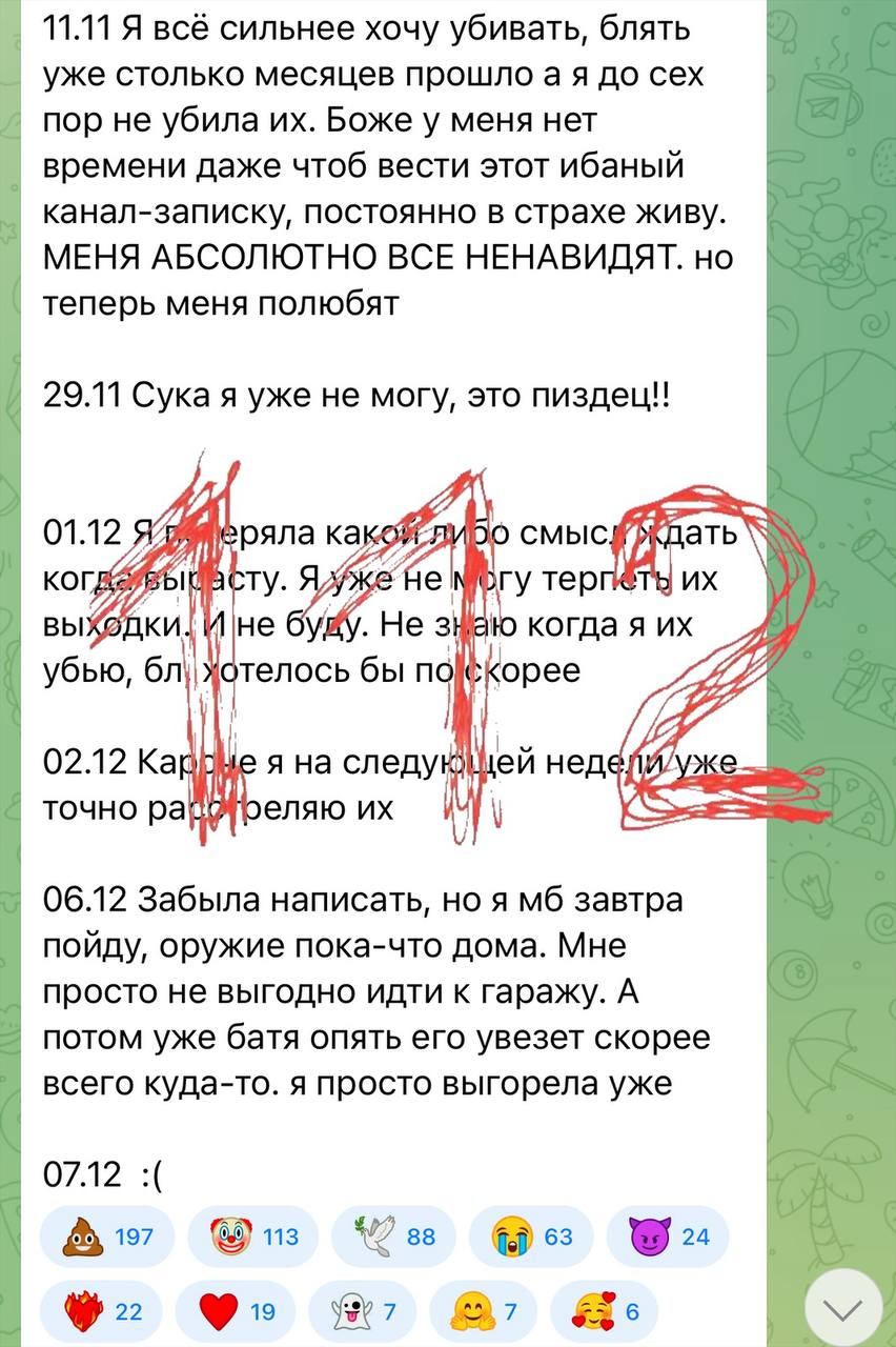 Девушка весь сентябрь сидела в специфических чатах, изучала мануалы по изготовлению СВУ и постоянно писала в дневнике, что мечтает перебить одноклассников. В декабре настала точка кипения. Алина дождалась, пока отец вернёт ружьё в сейф и сегодня принесла его в школу.