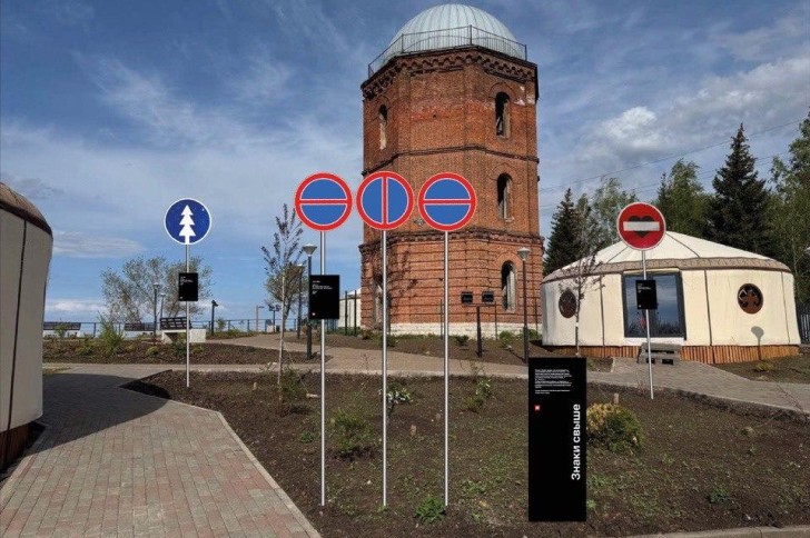 И у нас так получилось, что практически одновременно открылись две локации. В конце мая на территории «Арт-квадрата» – на стене я разместил выставку, которая будет идти все лето. А на площадке старой водонапорной башни – это уже реализовано в формате арт-объекта. То есть, на столбах, как настоящие дорожные знаки, располагаются вот эти новые знаки, превращенные в предметы современного искусства. Они рассредоточены по этой смотровой площадке. То есть, как бы, получается, что сама смотровая площадка становится открытый галерей, и это останется, ну, я надеюсь, надолго. Вот такая, вкратце, история.