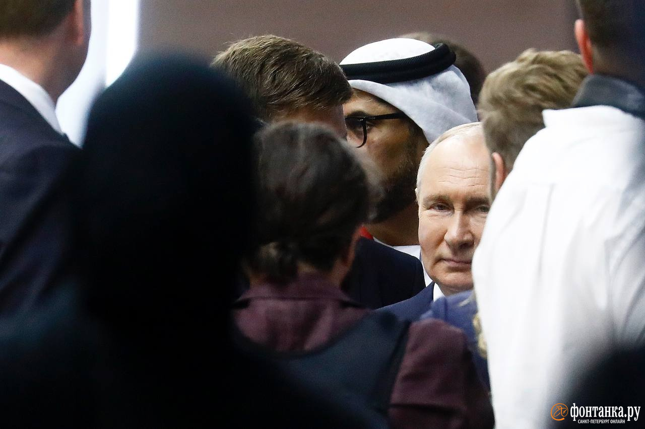 Несколькими часами ранее президент прибыл в «Экспофорум», где осмотрел стенд Объединенных Арабских Эмиратов в рамках ПМЭФ-2023. Компанию ему составил президент ОАЭ Мохаммед бин Зайд аль-Нахайян. По словам корреспондента «Фонтанки», основную часть журналистов не допустили в секцию зоны G «Экспофорума», где и находится стенд ОАЭ, они наблюдали за происходящим из-за ограждающей ленты.