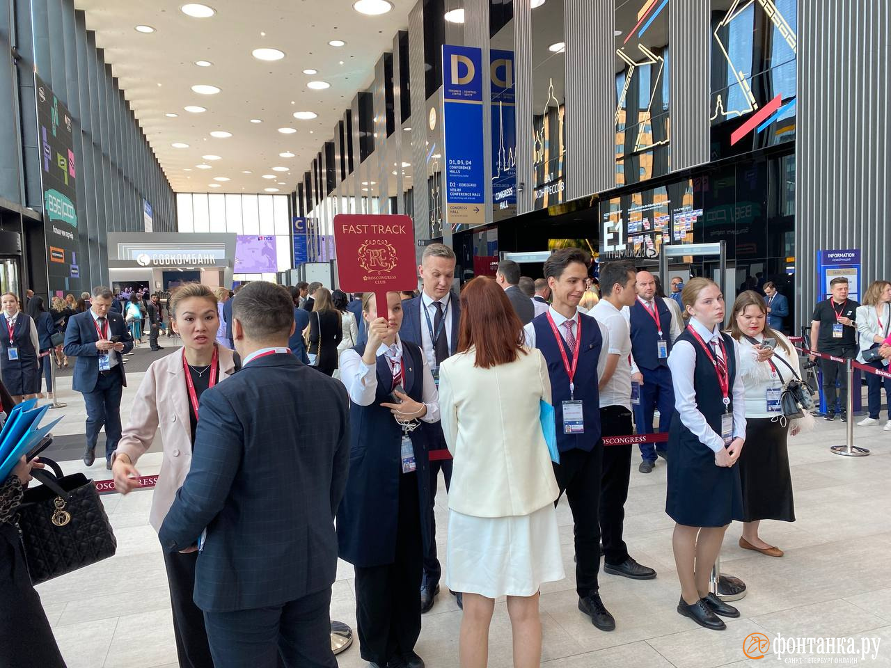 Корреспонденты «Фонтанки» сообщают, что к проходу в конгресс-холл (там будет проходить пленарка) уже выстроились внушительные очереди.