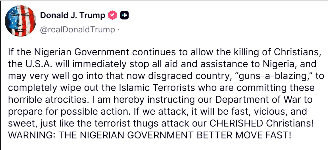Дословно: «Если нигерийское правительство продолжит позволять убивать христиан, США немедленно прекратят всякую помощь и содействие Нигерии и вполне могут войти в эту ныне опозоренную страну, чтобы полностью уничтожить исламских террористов, которые совершают эти ужасающие зверства. Я поручаю Министерству войны подготовиться к возможным действиям. Если мы нападем, то это будет быстро и яростно, точно так же, как террористы-головорезы нападают на наших ДОРОГИХ христиан! ПРЕДУПРЕЖДЕНИЕ: ПРАВИТЕЛЬСТВУ НИГЕРИИ БЫЛО БЫ ЛУЧШЕ ДЕЙСТВОВАТЬ БЫСТРО».