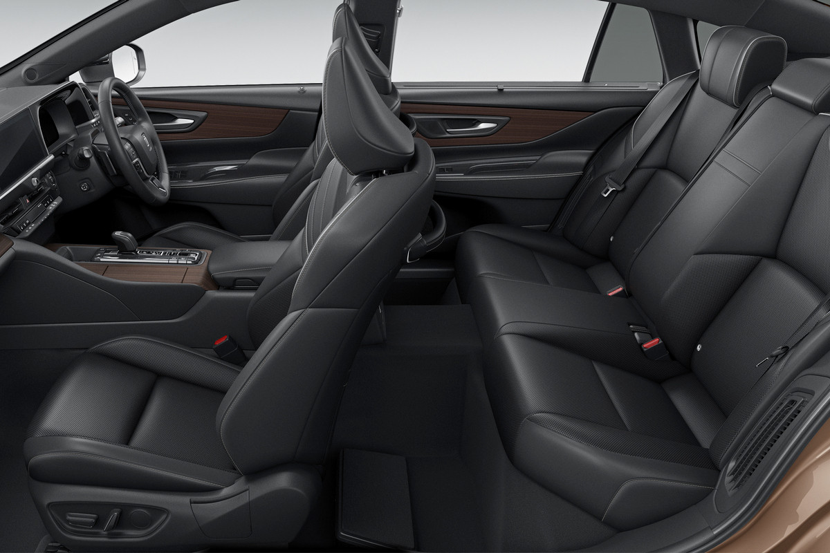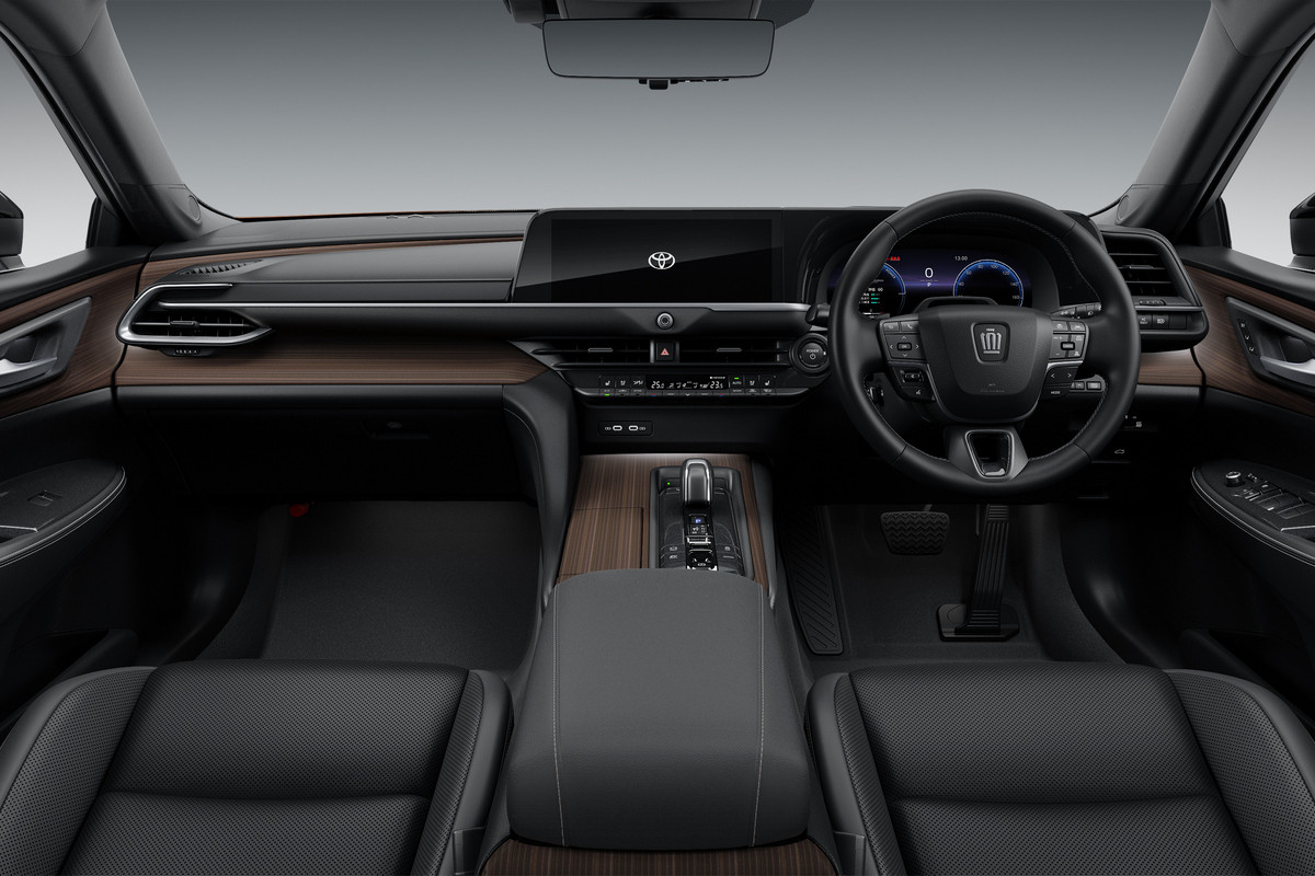 В Японии Toyota Crown Sedan доступен в двух модификациях, обе – исключительно с задним приводом. Базовая – это гибрид HEV, то есть без возможности подзарядки от электросети. В состав установки такой четырехдверки вошли бензиновый четырехцилиндровый атмосферник A25A-FXS 2.5 (185 л.с.) и пара электромоторов. Вторая модификация – водородная (FCEV), с техникой, как у родственной модели Toyota Mirai: у этого Crown Sedan 182-сильный электромотор (на задней оси) и три баллона для водорода; паспортная дальнобойность на одной заправке – 820 км.