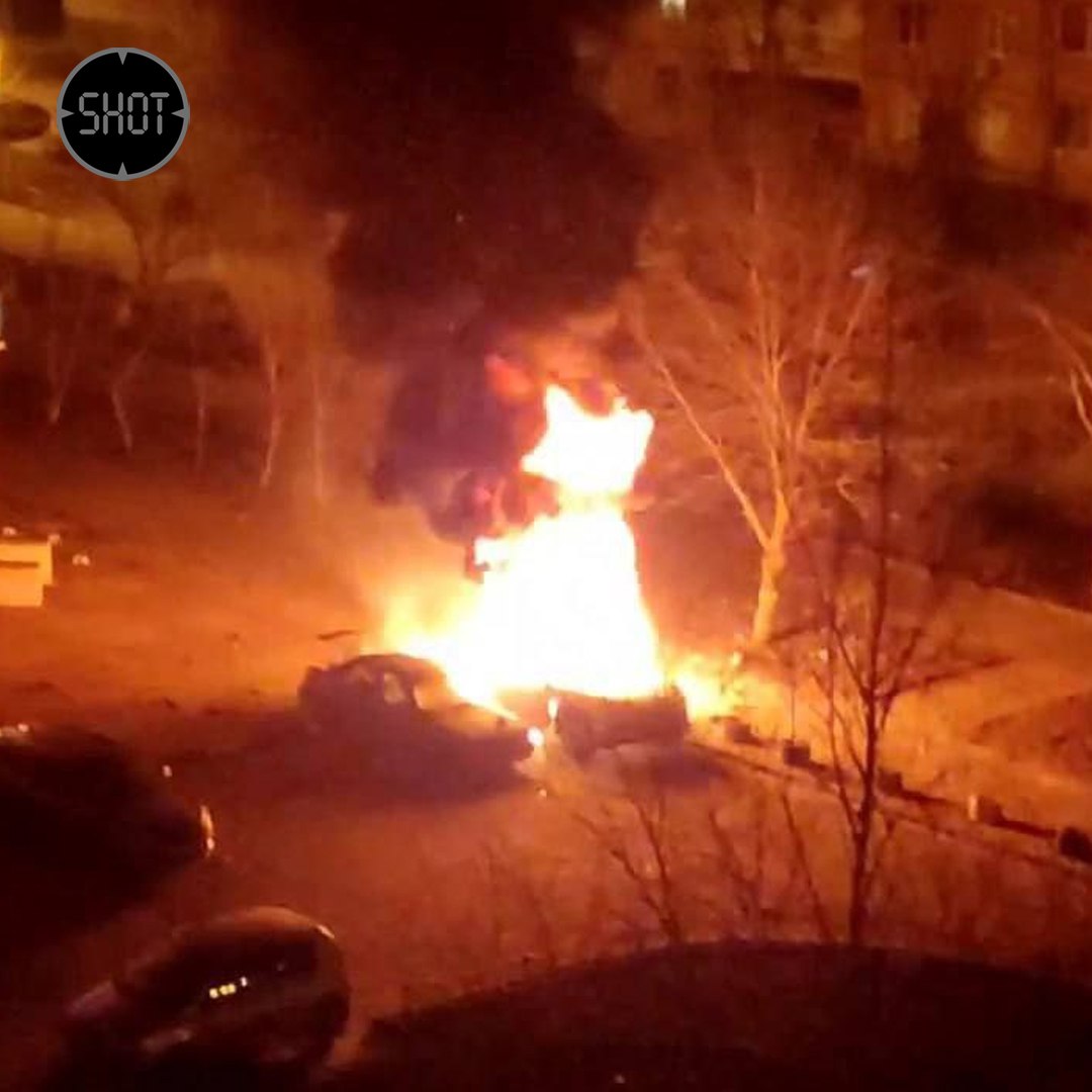 По предварительным данным, один из обломков прилетел в стоящий на парковке автомобиль (на фото), его уже потушили сотрудники МЧС. В данный момент официальной информации о пострадавших нет.