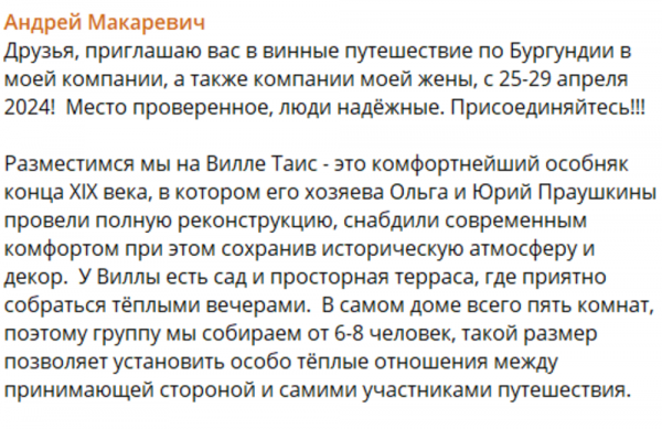 Он периодически ездит с гастролями по Европе, но не слишком интенсивно. Параллельно зовёт всех желающих поехать с ним и его супругой в "винное путешествие по Бургундии". По его словам: "Место надёжное, люди проверенные". За продажу мест в эту необычную турпоездку, над Макаревичем уже стали подшучивать в сети и называть его "продвинутой версией инфоцыгана".