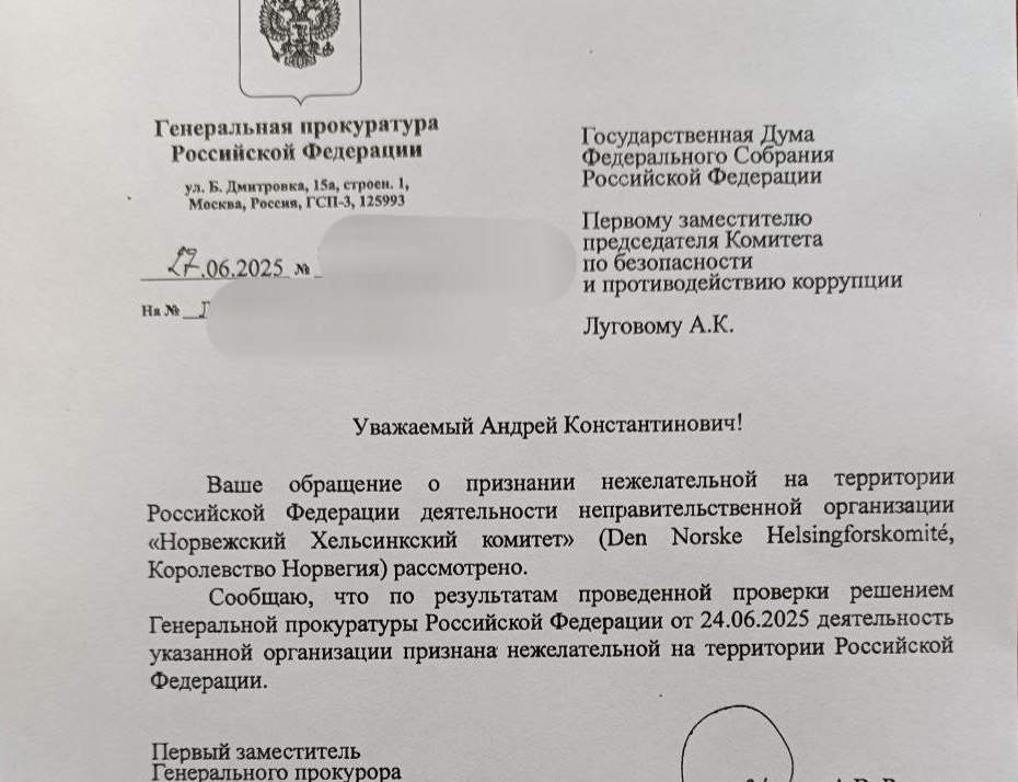 Генпрокуратура России объявила нежелательной организацией Норвежский Хельсинский комитет, заявил депутат Госдумы от ЛДПР Андрей Луговой. Он опубликовал ответ ведомства на его просьбу признать комитет нежелательным.