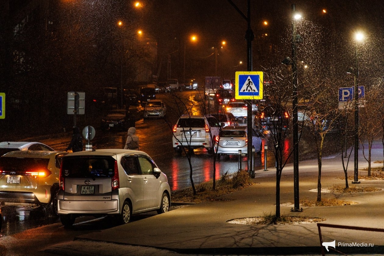 PrimaMedia, 27 ноября. Дневной дождь во Владивостоке сменился вечерним снегом с дождём. В разных районах города дежурит спецтехника, собрались пробки.