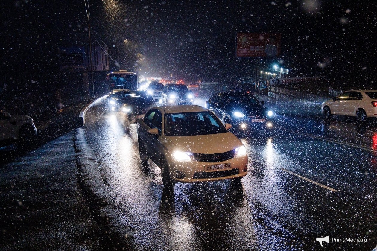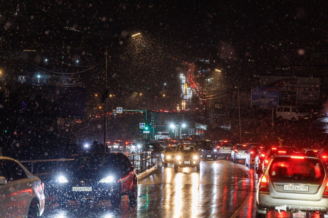 Во Владивостоке "зарядил" снег с дождем, собрались пробки — фото, видео