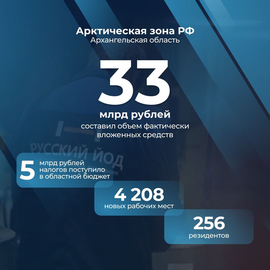 Архангельская область уверенно сохраняет за собой первое место среди всех арктических субъектов России по количеству реализованных резидентами проектов в этой зоне. На сегодняшний день успешно запущено 100 бизнес-инициатив, в рамках которых вложено почти 33 млрд рублей, создано 4,2 тыс. рабочих мест, а налоги составили 17 млрд рублей, 5 млрд. из которых поступили в бюджет Архангельской области. А в перспективе в регионе будет создано свыше 7,6 тыс. рабочих мест, привлечено 207 млрд рублей инвестиций.