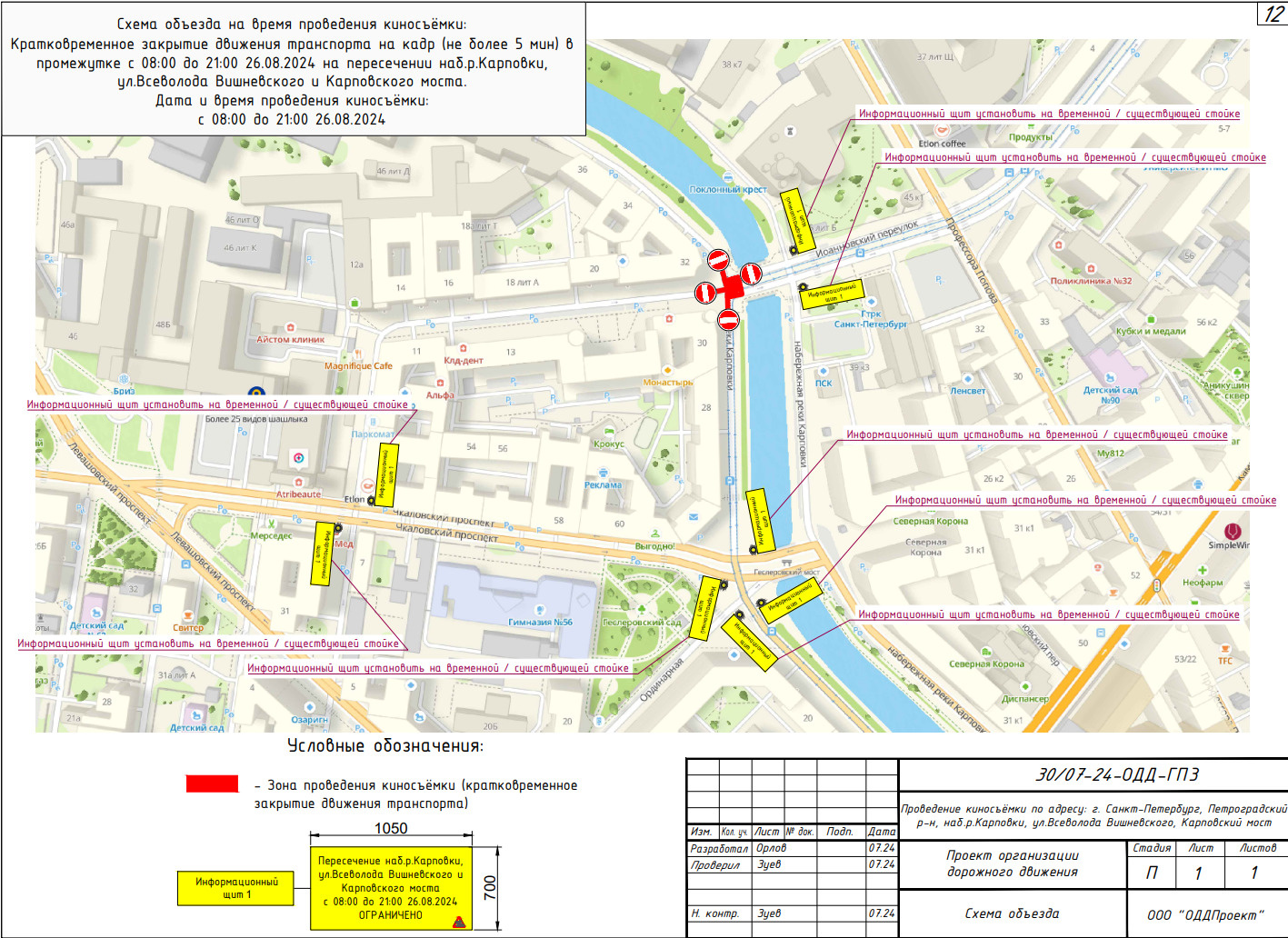 - с 8:00 до 21:00 26 августа — на пересечении набережной Карповки с улицей Всеволода Вишневского.