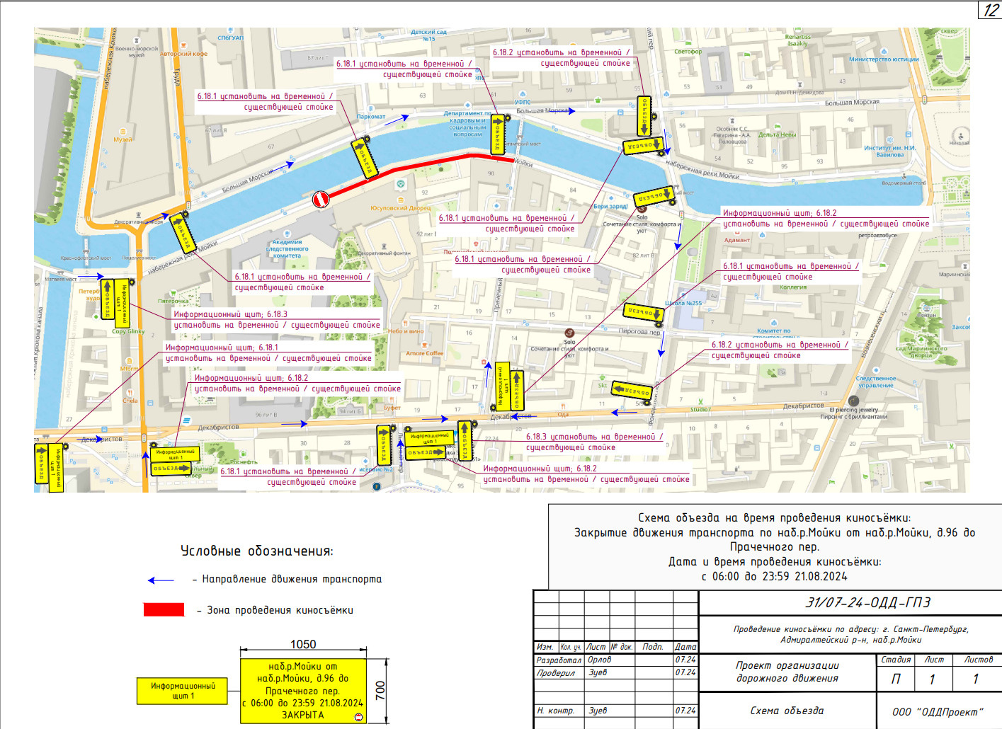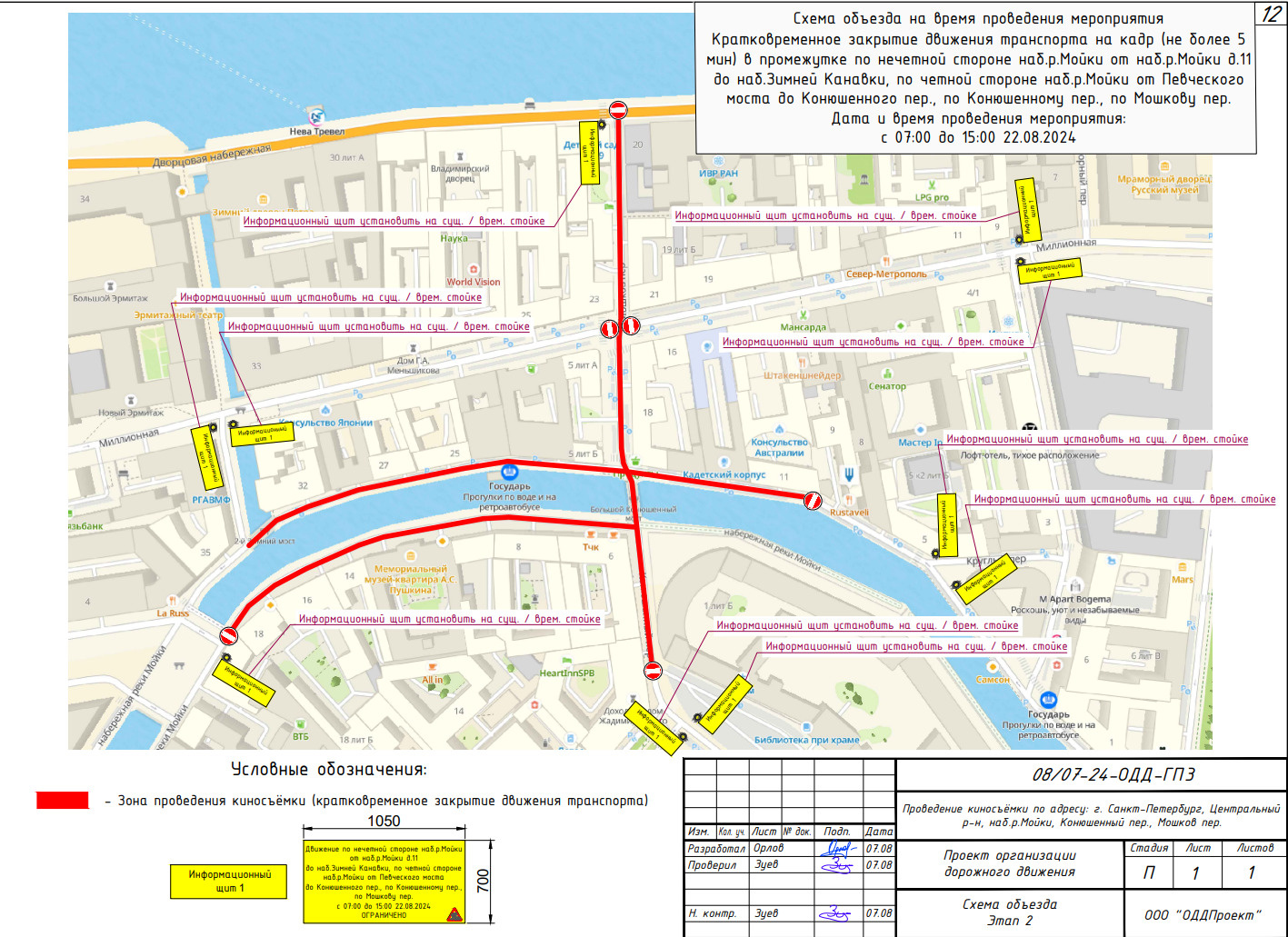 - с 0:00 до 15:00 22 августа — в Мошковом переулке от дома 4 до дома 6 и вдоль дома 8, на набережной Мойки от дома 11 до Мошкова переулка;