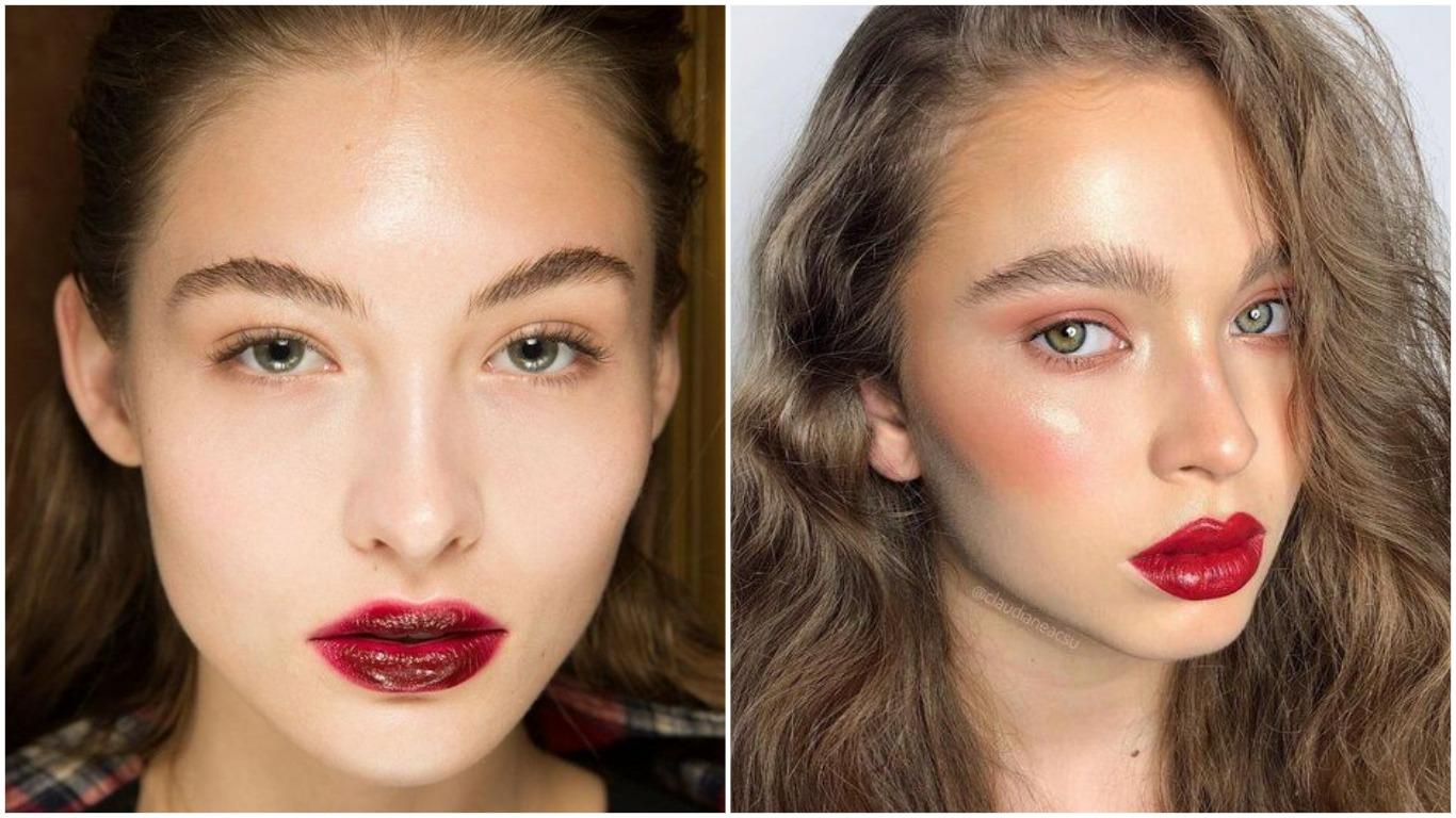 Для губ лучше всего использовать красный тинт. После того, как он высохнет, возьмите коричневый карандаш и прорисуйте контур. Поверх нанесите оттеночный бальзам в алом оттенке для увлажнения. Вуаля — макияж завершен.