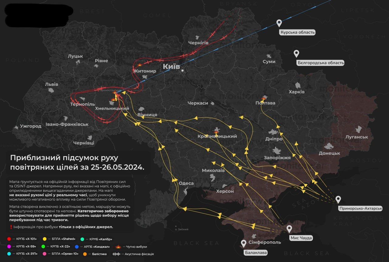 Карта ночных ударов ВС РФ по целям на территории Украины по информации профильных ресурсов.