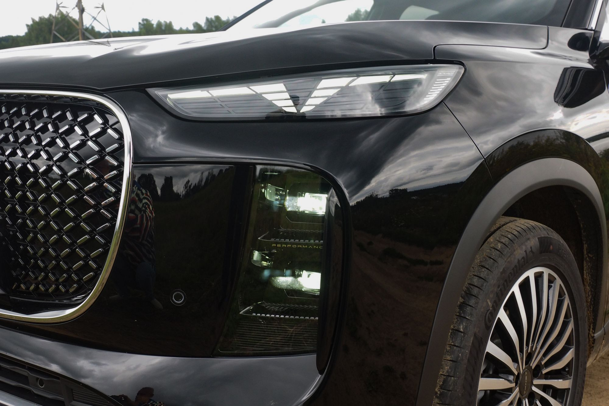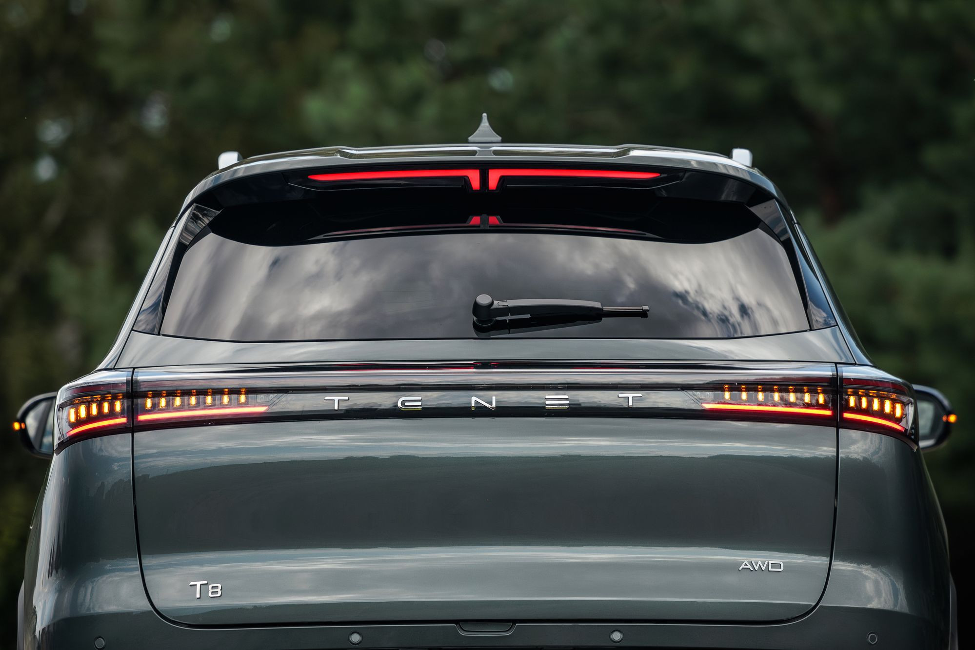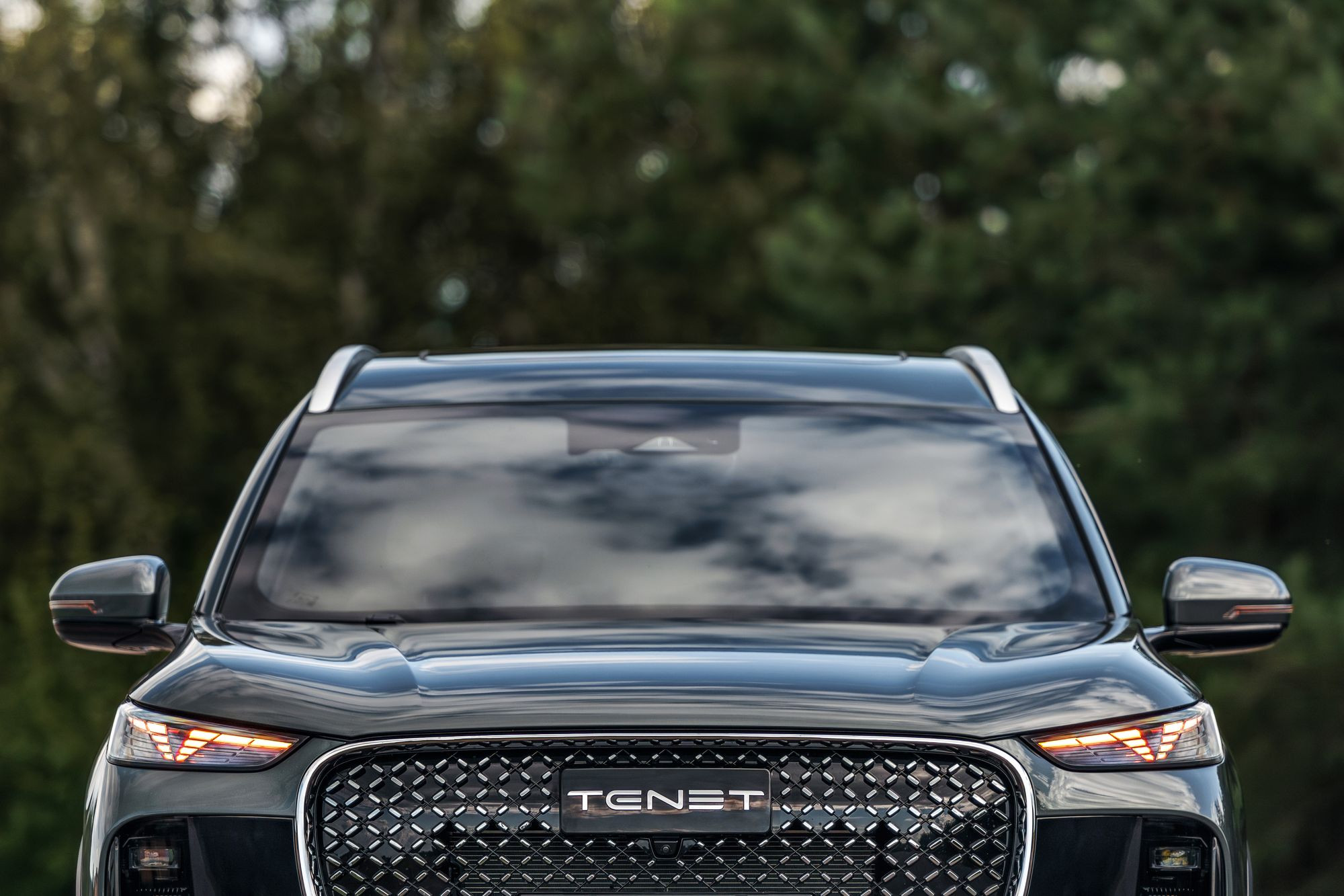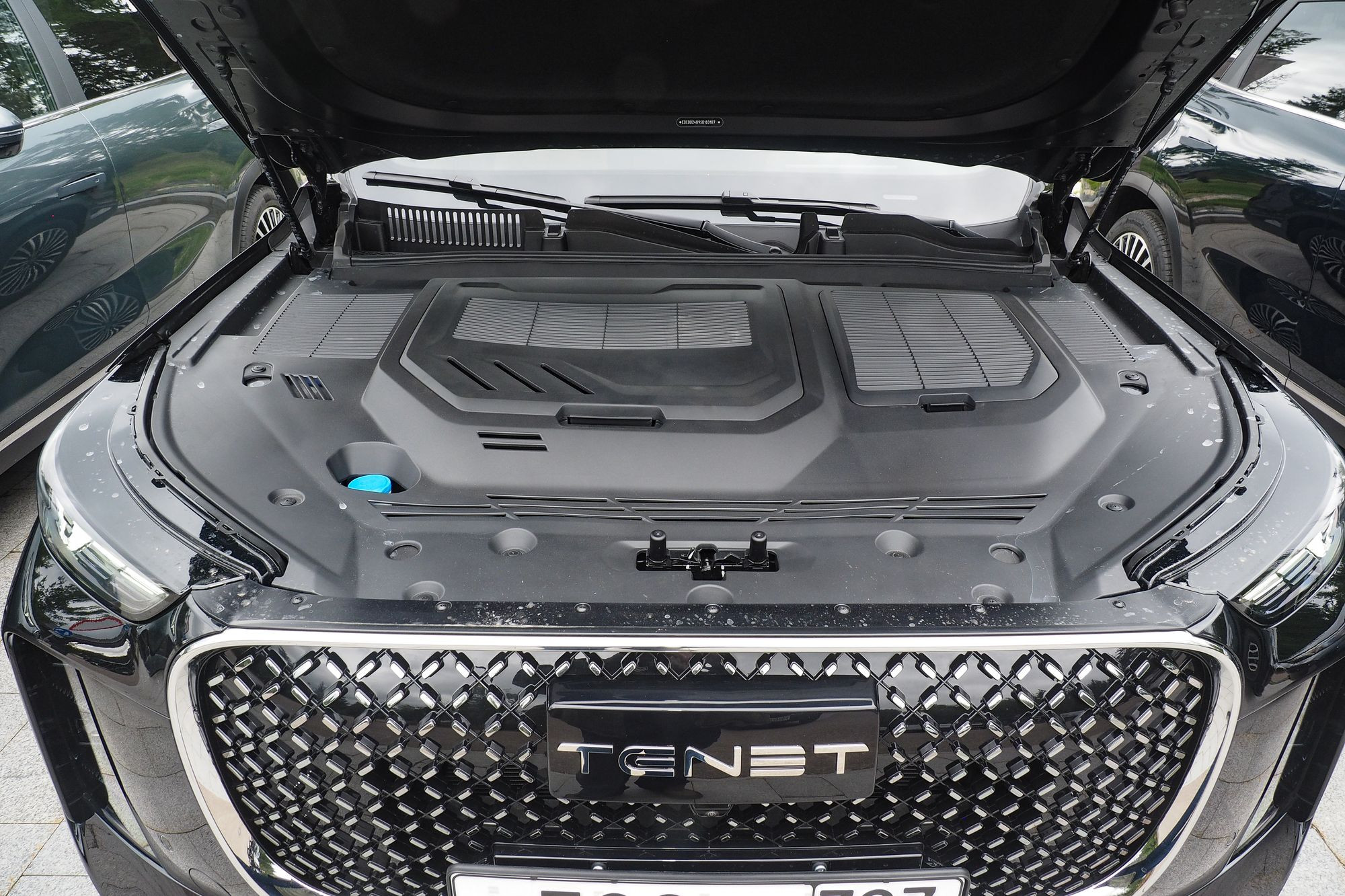 Различается и оформление передней части, где Tenet Т8 и Tiggo 8 Pro Max роднит разве что общая массивность облицовок радиатора. Но формы у них все же разные: у Chery решетка имеет очертания многоугольника, заполненного градиентным рисунком «бриллиантовых» элементов, а у Tenet это трапеция со скругленными краями, заполненная «сеточкой» из небольших хромированных элементов в виде прямоугольников. Но главное – это светотехника. В случае Tenet T8 архитектура ее размещения, скорее, напоминает таковую у Jaecoo J7 с его горизонтальными дневными ходовыми огнями в верхней части и «двухэтажным» размещением фар ближнего и дальнего света со светодиодными источниками. Сам же рисунок дневных ходовых огней можно назвать уникальным. Он напоминает и букву Т, и силуэт летящей чайки, а в компании называют его «кошачьи глазки». Эти же светодиоды выполняют и роль поворотников. Единственное, что меня смутило, это отсутствие противотуманных фар и места для их установки. Все-таки ситуации, когда противотуманки оказываются исключительно полезны, возникают на наших дорогах не так уж редко.