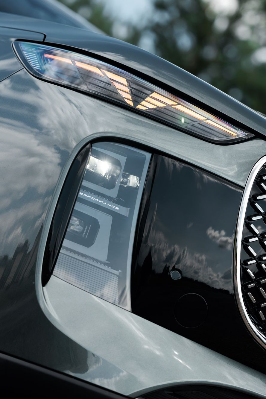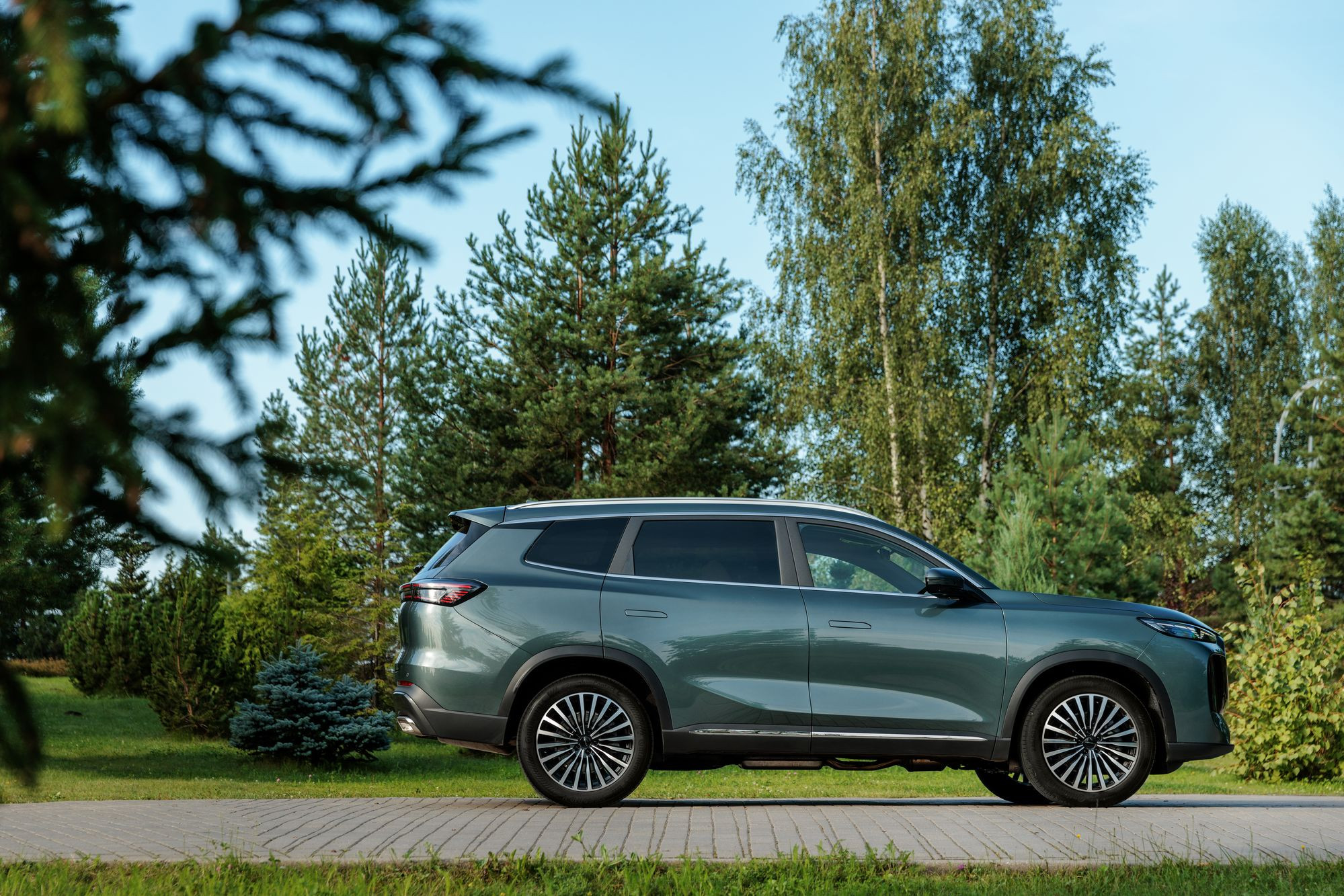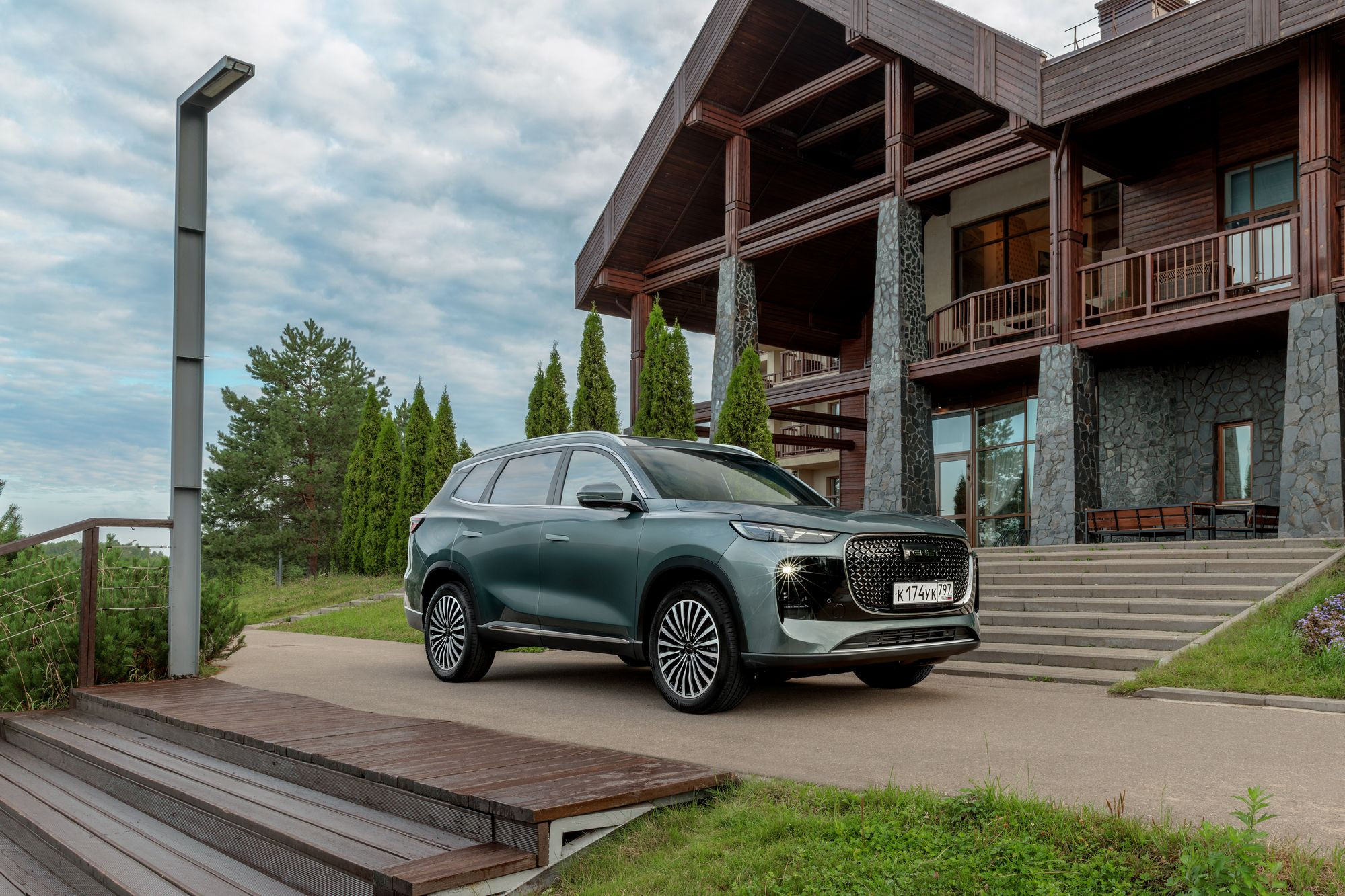 Различается и оформление передней части, где Tenet Т8 и Tiggo 8 Pro Max роднит разве что общая массивность облицовок радиатора. Но формы у них все же разные: у Chery решетка имеет очертания многоугольника, заполненного градиентным рисунком «бриллиантовых» элементов, а у Tenet это трапеция со скругленными краями, заполненная «сеточкой» из небольших хромированных элементов в виде прямоугольников. Но главное – это светотехника. В случае Tenet T8 архитектура ее размещения, скорее, напоминает таковую у Jaecoo J7 с его горизонтальными дневными ходовыми огнями в верхней части и «двухэтажным» размещением фар ближнего и дальнего света со светодиодными источниками. Сам же рисунок дневных ходовых огней можно назвать уникальным. Он напоминает и букву Т, и силуэт летящей чайки, а в компании называют его «кошачьи глазки». Эти же светодиоды выполняют и роль поворотников. Единственное, что меня смутило, это отсутствие противотуманных фар и места для их установки. Все-таки ситуации, когда противотуманки оказываются исключительно полезны, возникают на наших дорогах не так уж редко.