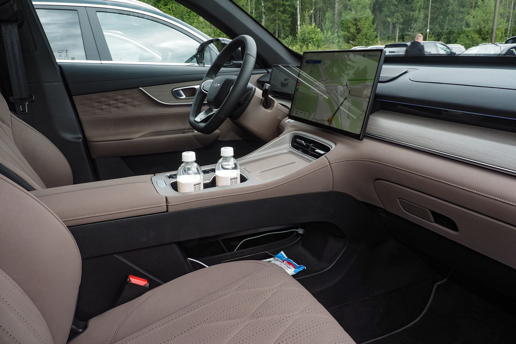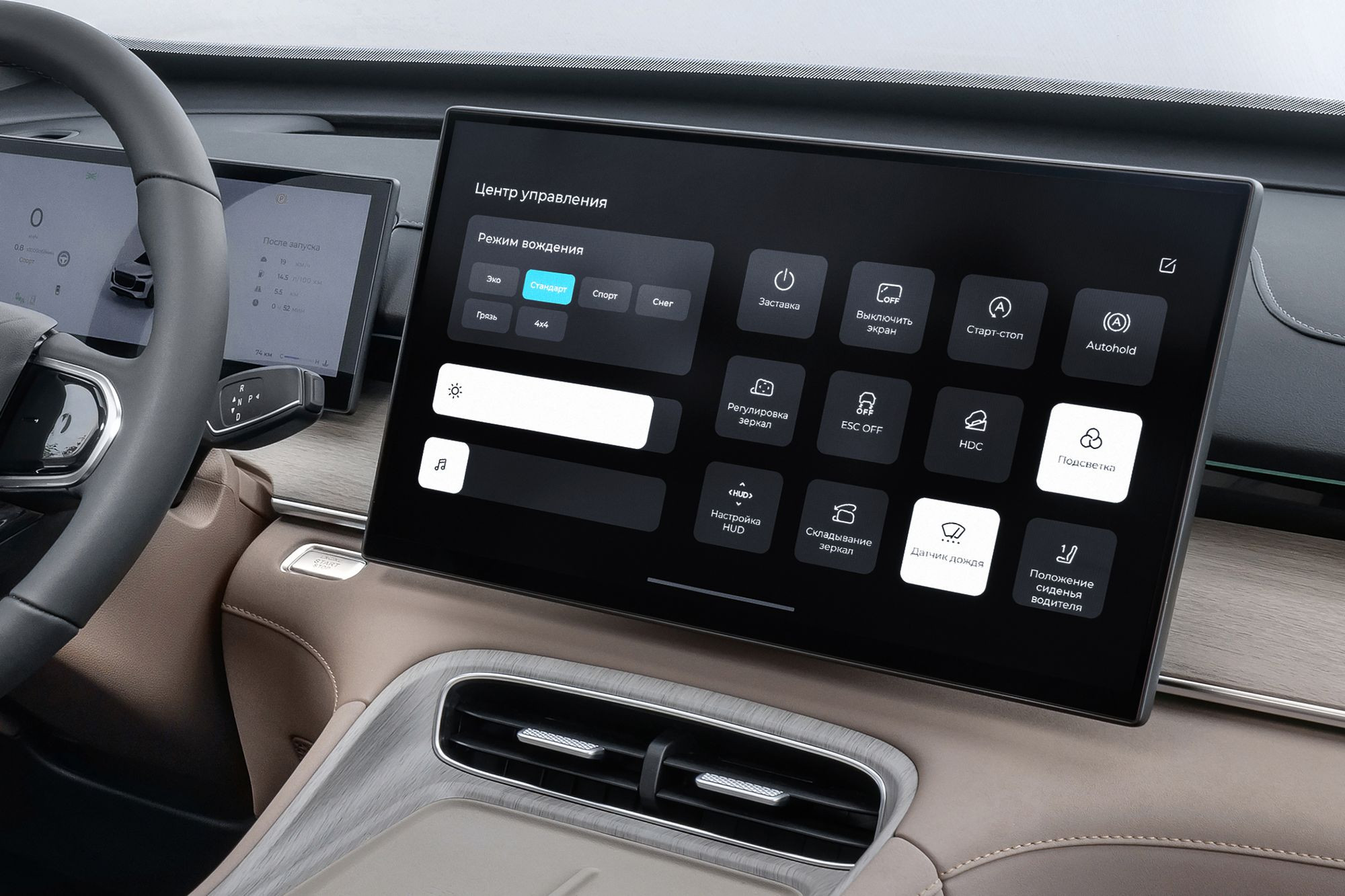 Здесь отличий от Chery Tiggo 8 Pro Max куда больше. И самое главное – другое расположение органов управления. Селектор управления коробкой передач занял место правого подрулевого переключателя. На трансмиссионном тоннеле осталась только «шайба» переключения режимов движения, причем таких же, как у Tiggo 8 Pro Max – «Эко», «Комфорт», «Спорт», «Снег», «Грунт» и «4×4». Левый подрулевой переключатель оказался нагружен многими функциями, включая управление передними и задними стеклоочистителями, а вот управление светом перекочевало в нижнюю часть передней панели слева от рулевой колонки.