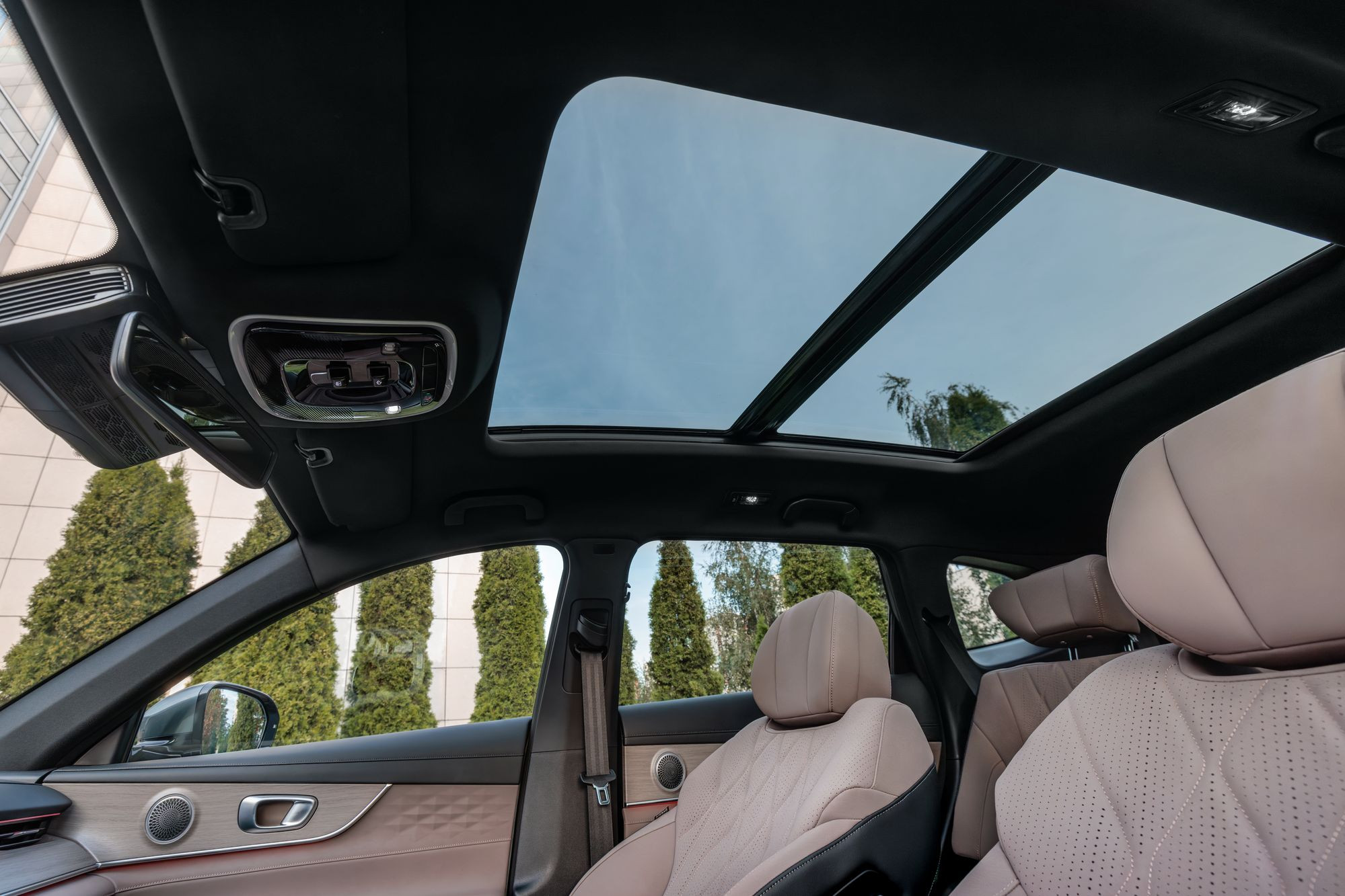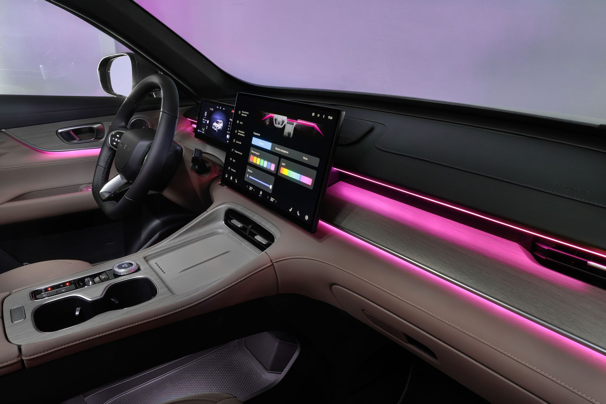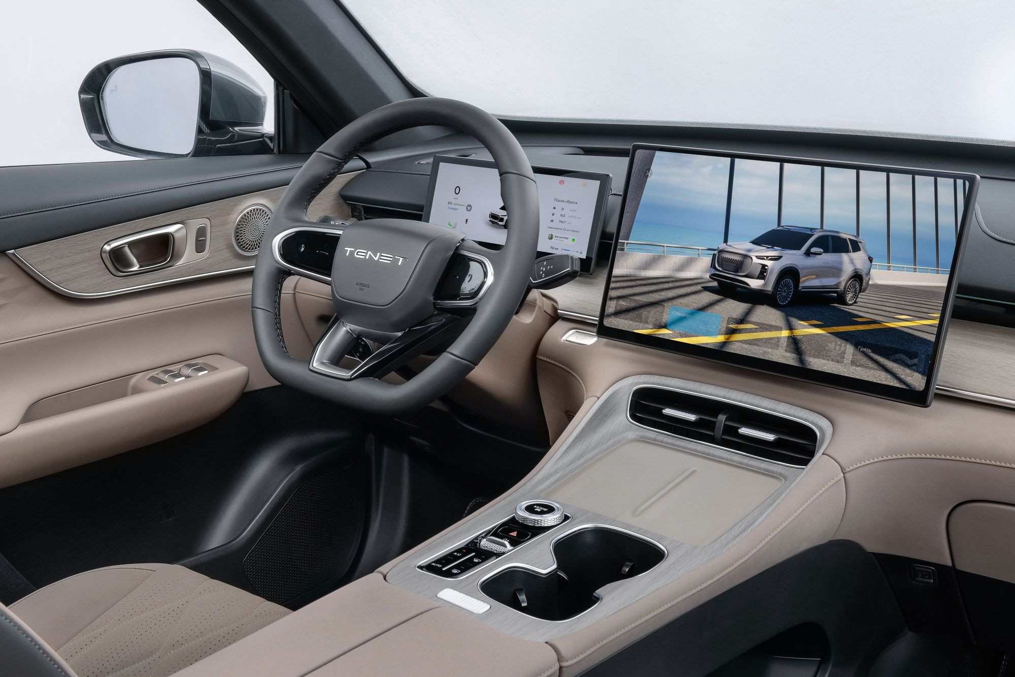 В Tenet T8 установлены два отдельных планшета с экранами альбомной ориентации. Левый с диагональю 10,3 дюйма выполняет роль комбинации приборов. Главный тачскрин медиасистемы имеет диагональ, равную 15,6 дюйма, как у приличных ноутбуков. Кроме того, есть и проекционный дисплей.