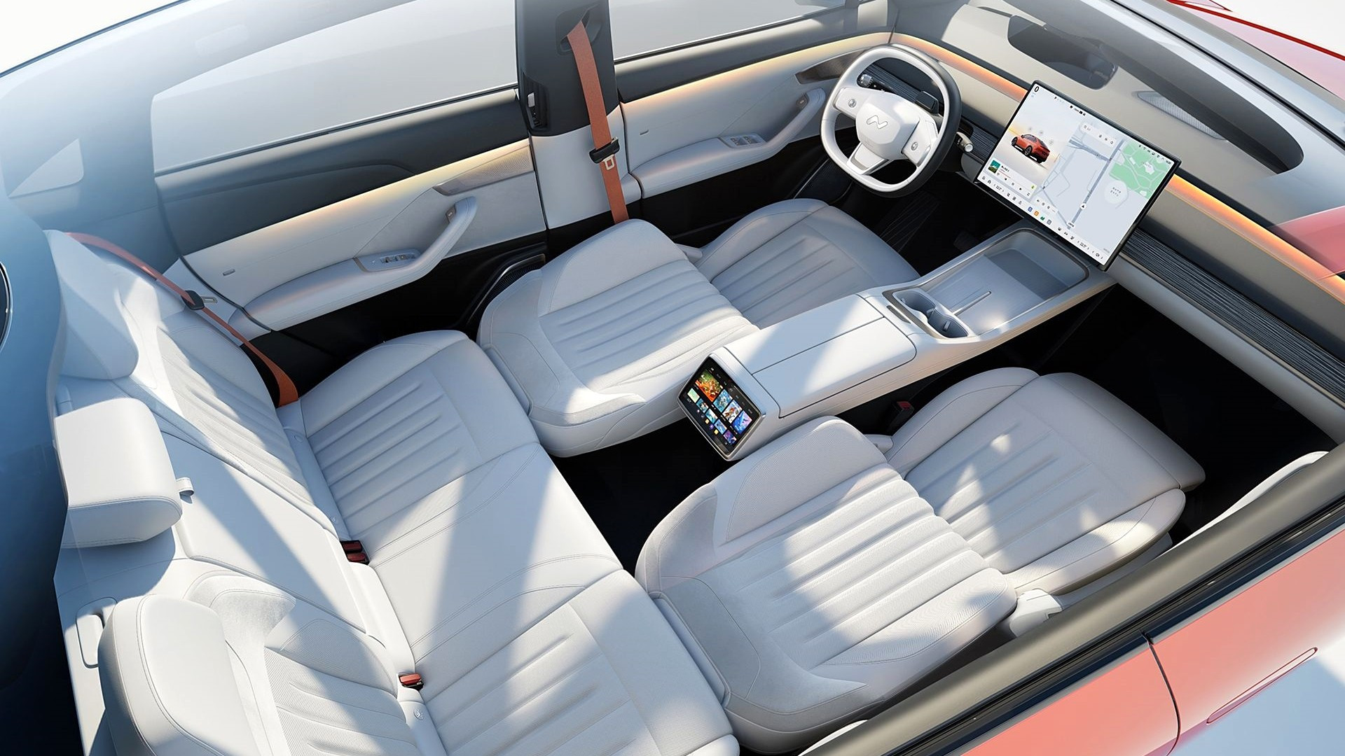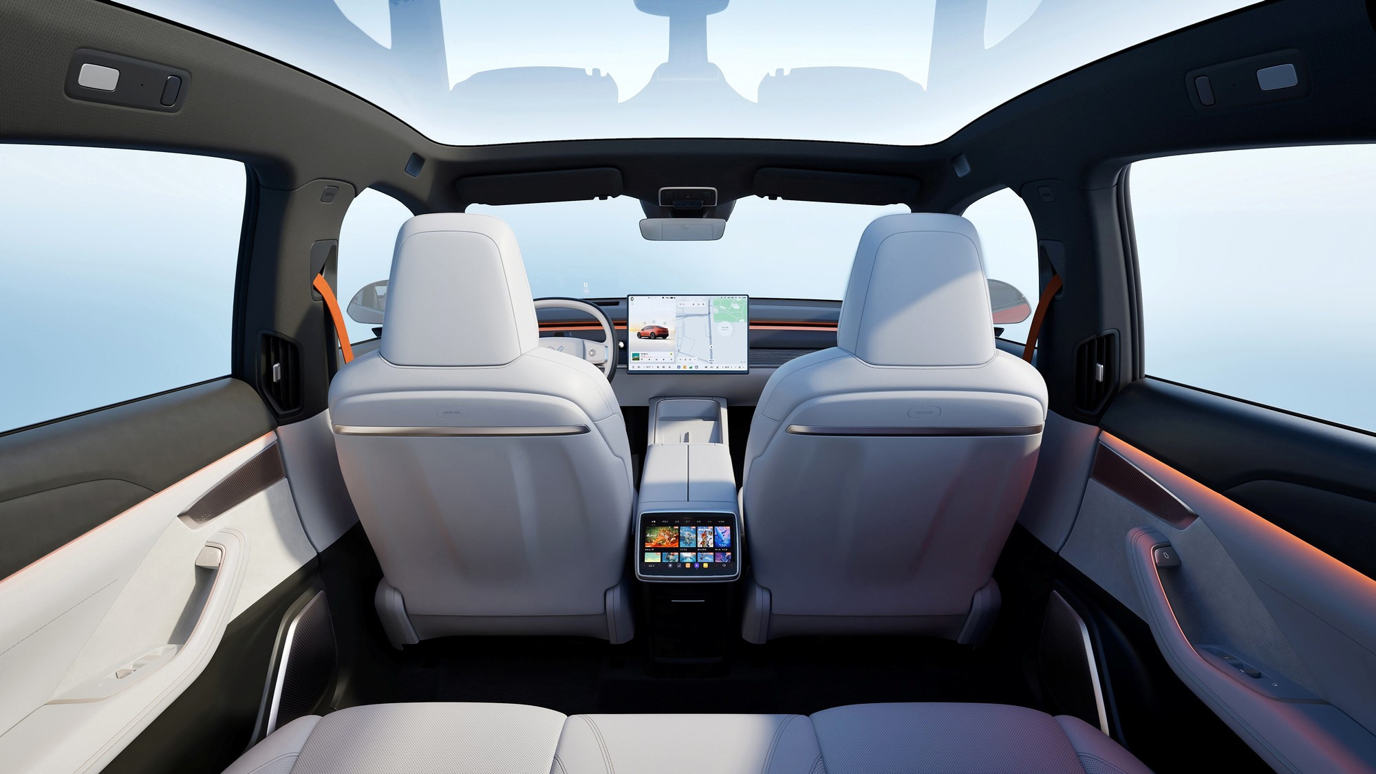 Салон Onvo L60 своим минимализмом и компоновочными решениями во многом повторяет салон Tesla Model Y. На передней есть только один центральный мультимедийный экран с диагональю 17,2 дюйма, роль щитка приборов выполняет проекционный экран на лобовом стекле. Отдельный 8-дюймовый развлекательный монитор предусмотрен для седоков второго ряда — он установлен на торце тумбы между передними креслами. Панорамная крыша во всю длину салона позволит наслаждаться солнцем и небом во время поездок. Штатная аудиосистема Onvo Sound мощностью 1000 Вт насчитывает 18 громкоговорителей.