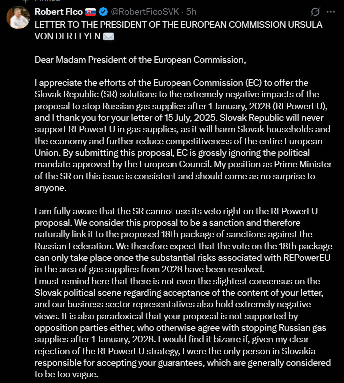 «Я ценю усилия Европейской Комиссии (ЕК) по предложению Словацкой Республике (СР) решений для смягчения крайне негативных последствий предложения о прекращении поставок российского газа после 1 января 2028 года (REPowerEU) <...>. Словацкая Республика никогда не поддержит REPowerEU в сфере поставок газа, поскольку это нанесет ущерб словацким домохозяйствам и экономике и еще больше снизит конкурентоспособность всего Европейского Союза. Представляя это предложение, ЕК грубо игнорирует политический мандат, одобренный Европейским Советом. Моя позиция как премьер-министра СР по этому вопросу последовательна и не должна ни для кого стать сюрпризом.