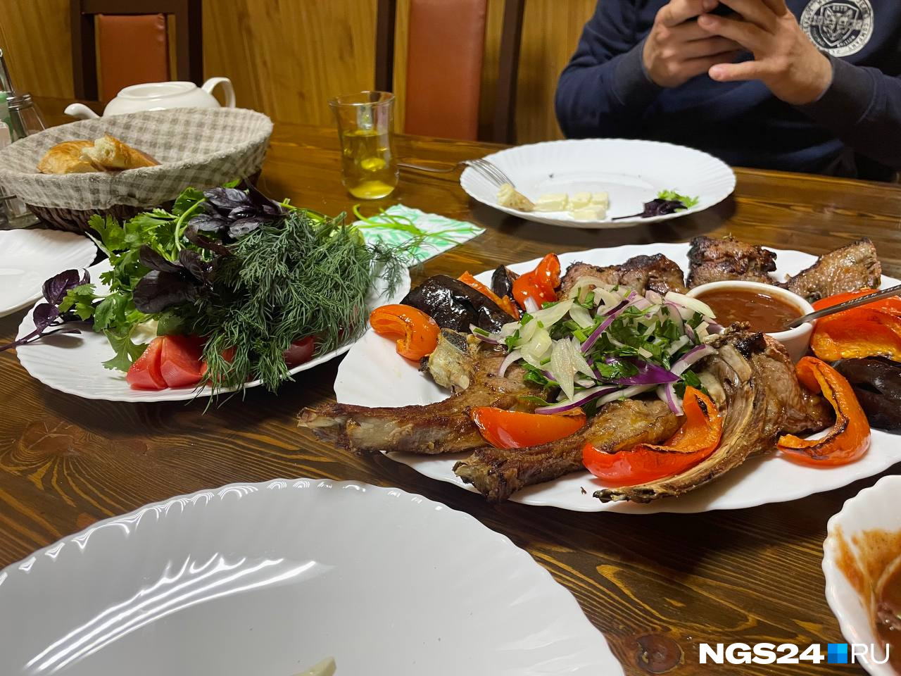 Нас проводят в тот самый «кабинет», внутри чисто, стоит большой стол на шестерых. Официант приносит меню. Молодой человек сразу же советует шашлык и рассказывает, что в основном ради него все сюда и приезжают. Из мяса — баранина, говядина, а также курица и рыба. Свинины, естественно, нет — в мусульманских странах ее не едят. Мы заказали шашлык из говядины, антрекот из баранины, картошку в мундире и пахлаву.