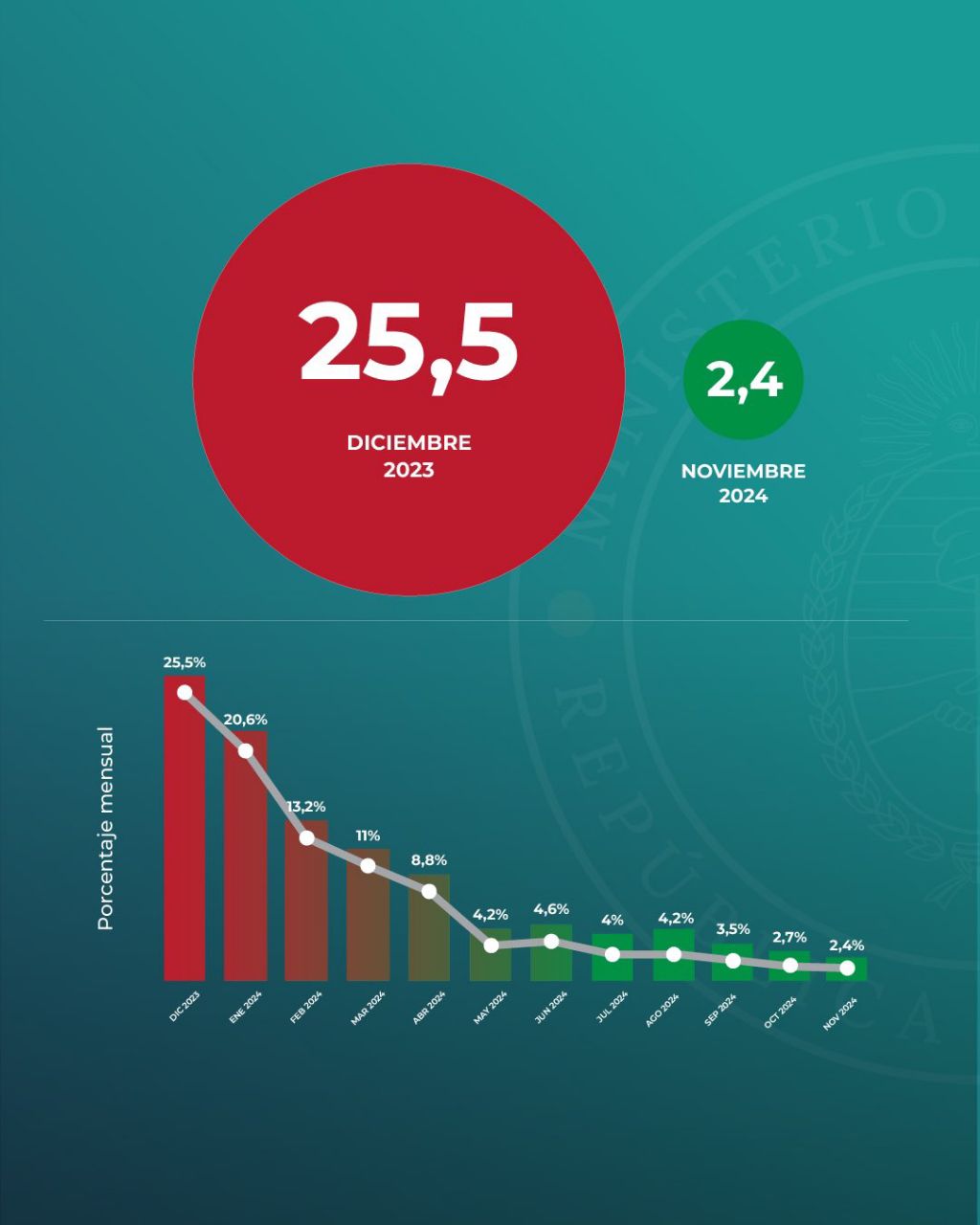 ✔️В Аргентине политика президента Хавьера Милея привела к снижению инфляции с 25% за месяц до 2,6%.