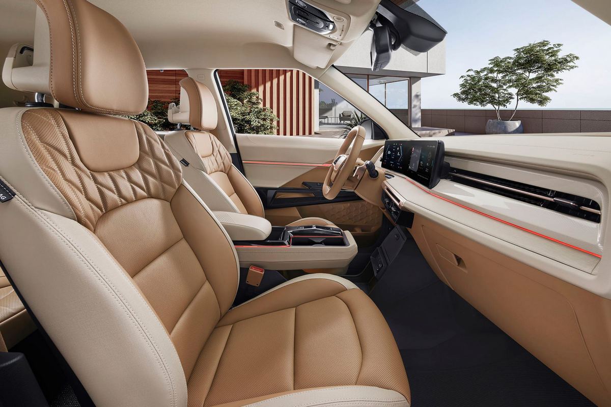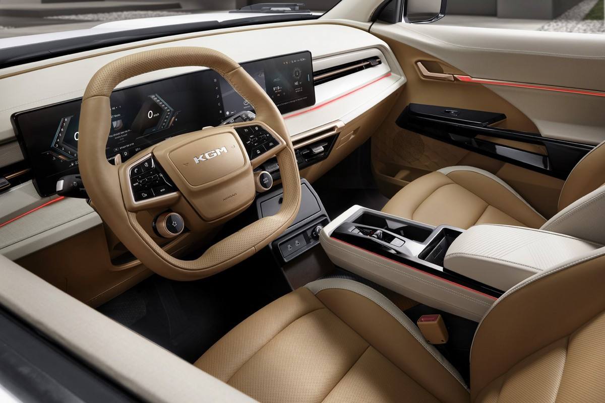 Внутри новый паркетник в целом повторил нынешний KGM Torres и его электроверсию с приставкой EVX. Напомним, салон с табло и расположенной между креслами «парящей» консолью донорский «традиционный» кроссовер обрел совсем недавно – прежде у него были отдельные экраны и массивный тоннель.