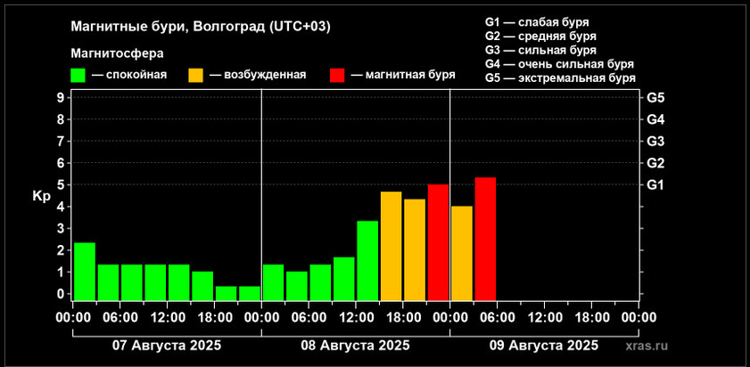 В ночь с 8 на 9 августа началась магнитная буря уровня G1.3. Согласно данным, предоставленным лабораторией солнечной астрономии ИКИ и ИСЗФ РАН, накануне примерно в 17.00 по московскому времени планета вошла в зону влияния корональной дыры, что и стало причиной начала магнитных возмущений: