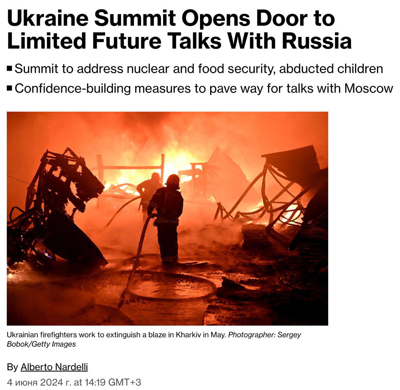 Bloomberg: «изначально Украина планировала заручиться на саммите поддержкой всей «формулы мира Зеленского», включающего вывод войск РФ на границы 1991 года, но затем сузила повестку до несколько пунктов формулы ради участия как можно большего количества стран».