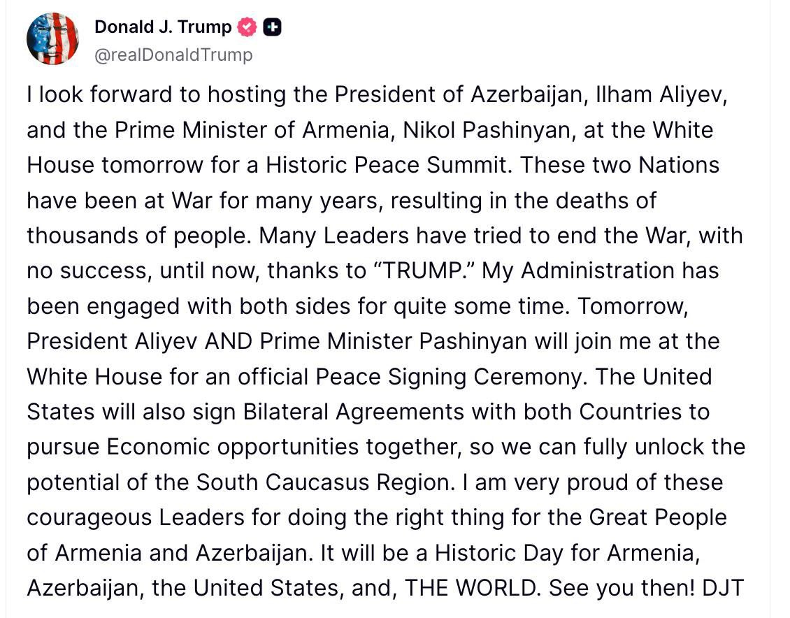 Трамп объявил, что Армения и Азербайджан подпишут мирный договор Президент США Дональд Трамп официально подтвердил, что 24 ноября в Вашингтоне состоится историческое событие: - Президент Азербайджана Ильхам Алиев - Премьер-министр Армении Никол Пашинян подпишут мирный договор при посредничестве США. Церемония пройдет в Белом доме. Дополнительные соглашения: - США заключат отдельные двусторонние договоры с каждой страной - Основной фокус - развитие экономического сотрудничества - Цель - реализация потенциала Южно-Кавказского региона