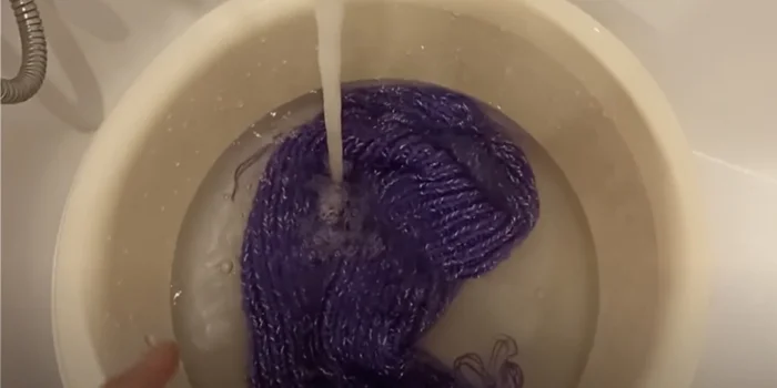 Легко сожмите шапку, чтобы удалить лишнюю воду, но не выкручивайте её. Дайте влаге стечь, оставив изделие на некоторое время в тазу.