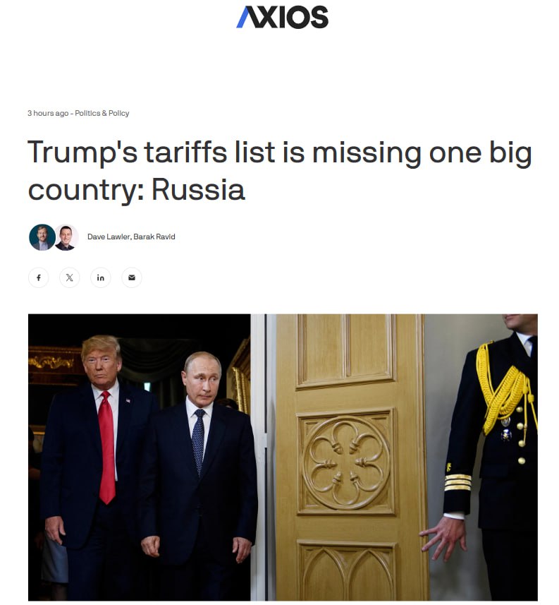 Россия была исключена из списка новых тарифов Трампа, потому что американские санкции уже «исключают любую значимую торговлю», однако Россия все еще может столкнуться с «дополнительными жесткими санкциями», сообщает Axios, ссылаясь на информацию, полученную от пресс-секретаря Белого дома Каролин Ливитт.