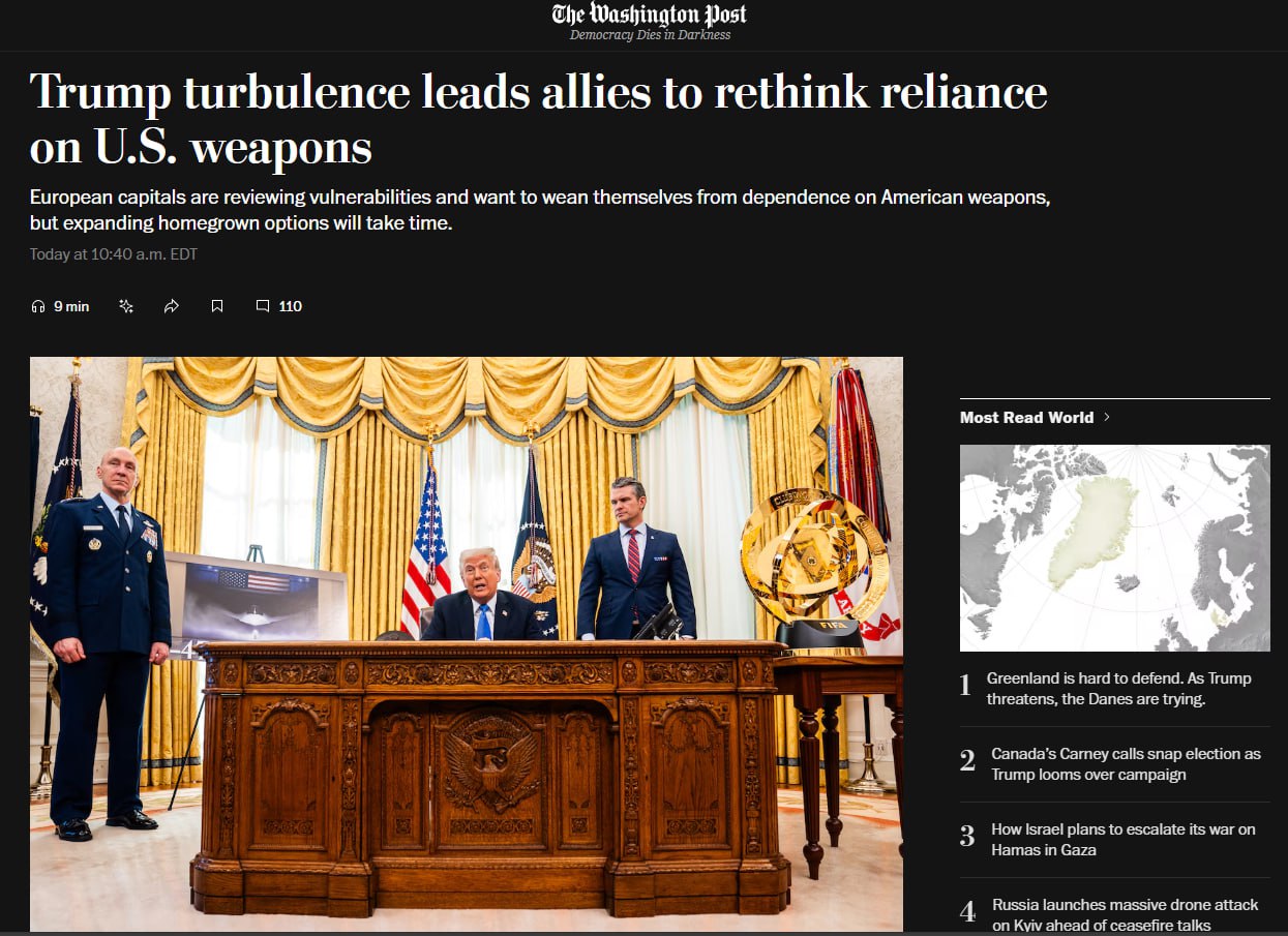 Политика Трампа заставляет Евросоюз переосмыслить зависимость от американского оружия, - Washington Post со ссылкой на источники.