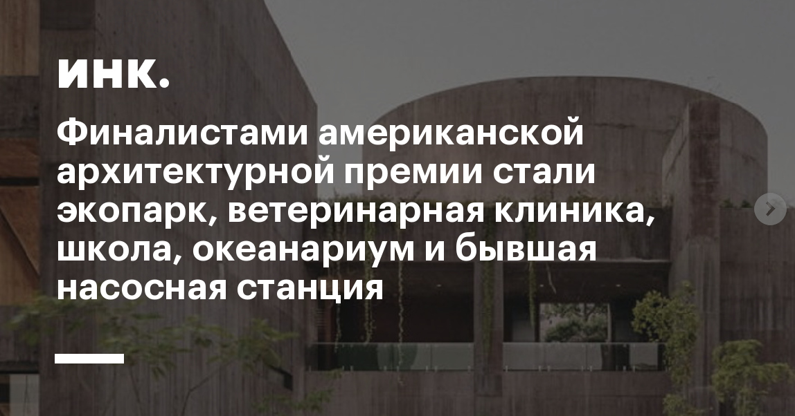 На награду претендуют экопарк от Colectivo C733, ветеринарная клиника Guayaquil от Адамо Файдена, школа в Арканзасе от Marlon Blackwell Architects, океанариум от Tatiana Bilbao Estudio и переоборудованная насосная станция в Виннипеге от 5468796 Architecture.