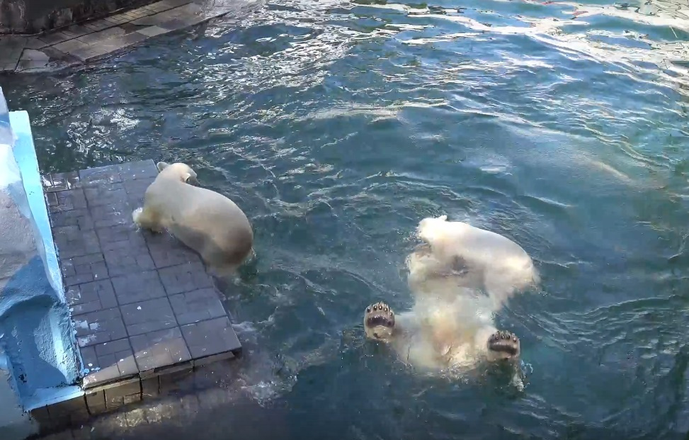 Белые медвежата с мамой устроили показательные прыжки в воду с высоты — забавное видео из Новосибирского зоопарка