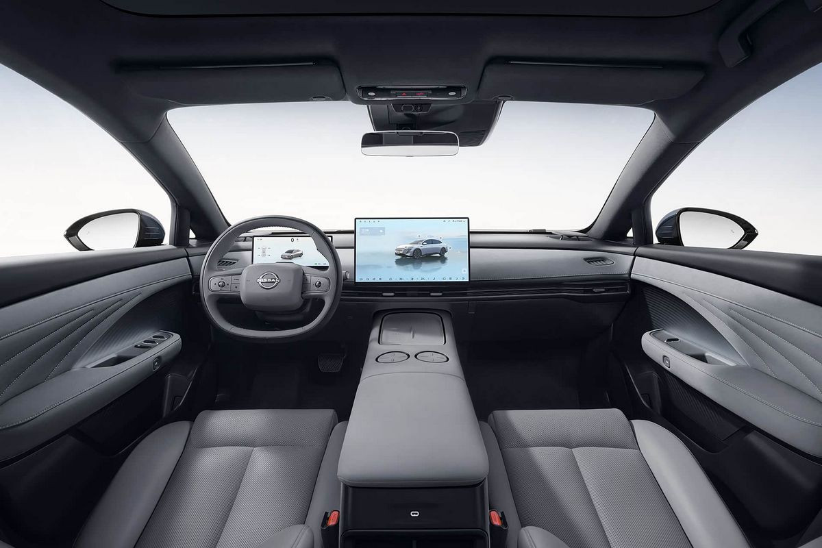 Внешность Nissan N6 оформлена в стиле электрокара: гибрид тоже имеет гладкую панель спереди, ходовые огни в виде единой плашки, фары-бумеранги, монофонарь и выдвижные ручки дверей. Длина равна 4831 мм, ширина – 1885 мм, высота – 1491 мм, колесная база – 2815 мм. Для сравнения, размеры Nissan N7: 4930/1895/1484 мм, расстояние между осями – 2915 мм. В состав силовой установки гибрида входит атмосферник 1.5 (102 л.с.), информации об электромоторе и батарее еще нет.