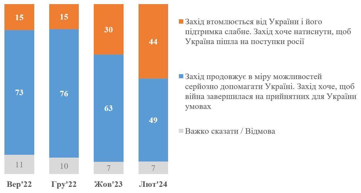 В феврале-2024, по сравнению с октябрем-2023, доля украинцев, которые считают, что Запад устает от Украины, увеличилась с 30% до 44%.