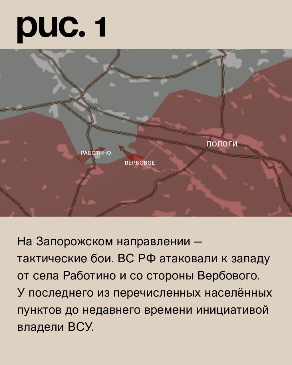 На Запорожском направлении – тактические бои. ВС РФ атаковали к западу от села Работино и со стороны Вербового. У последнего из перечисленных населённых пунктов до недавнего времени инициативой владели ВСУ. (Рис. 1)