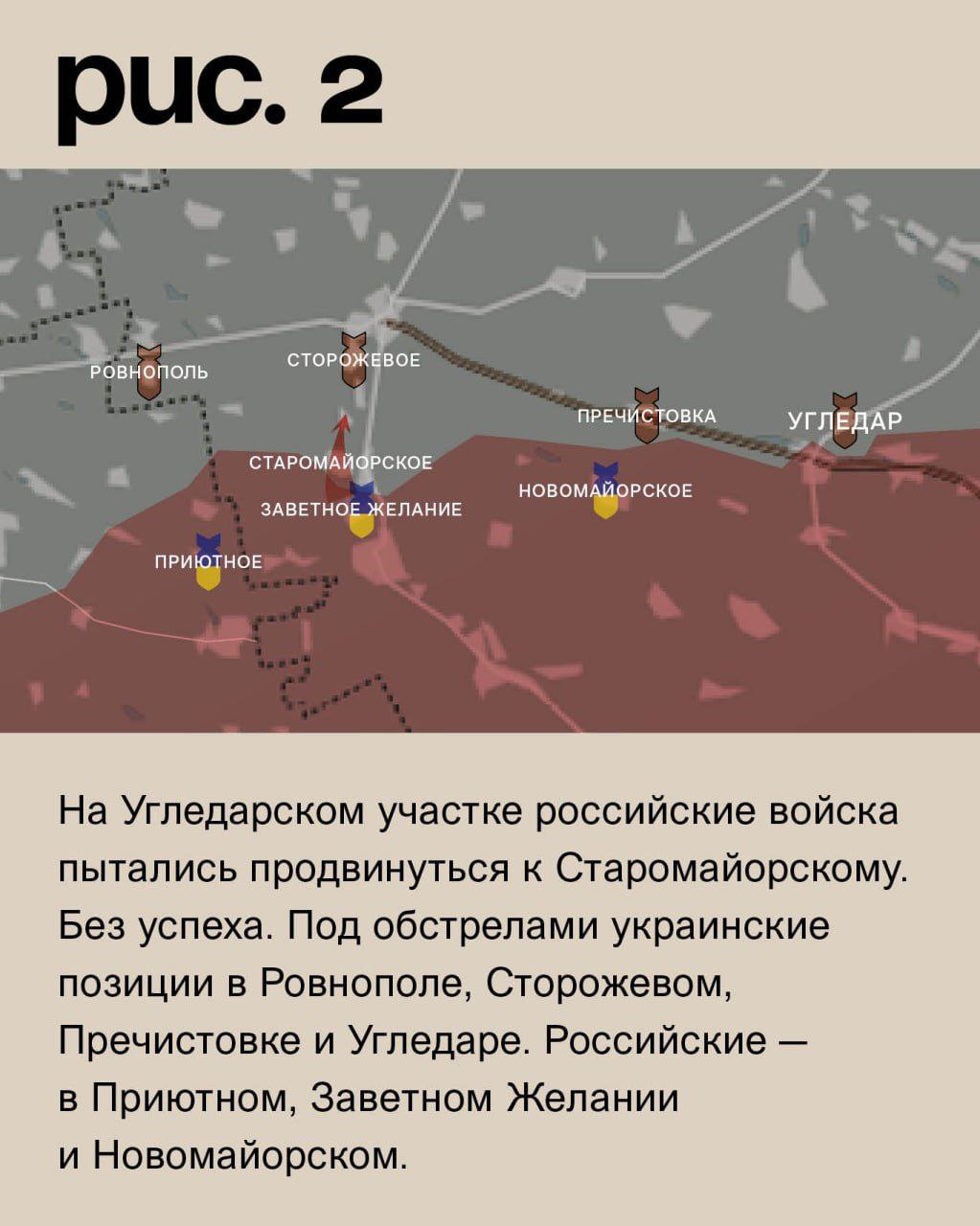 На Угледарском участке российские войска пытались продвинуться к Старомайорскому. Без успеха. Под обстрелами украинские позиции в Ровнополе, Сторожевом, Пречистовке и Угледаре. Российские – в Приютном, Заветном Желании и Новомайорском. (Рис.2)