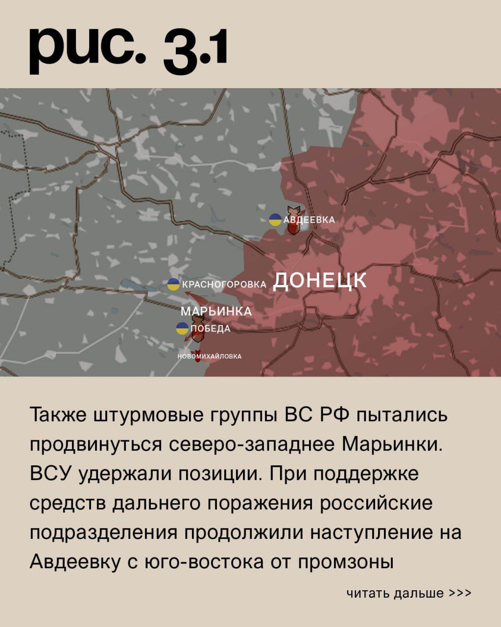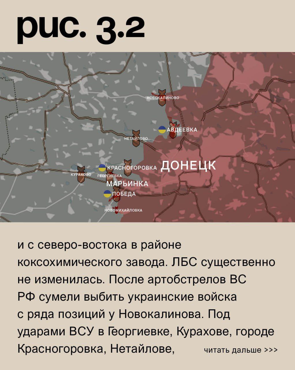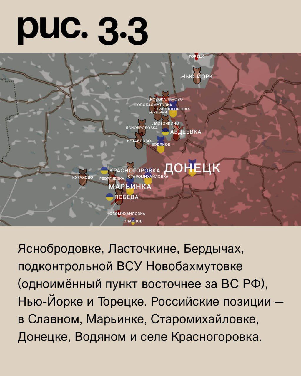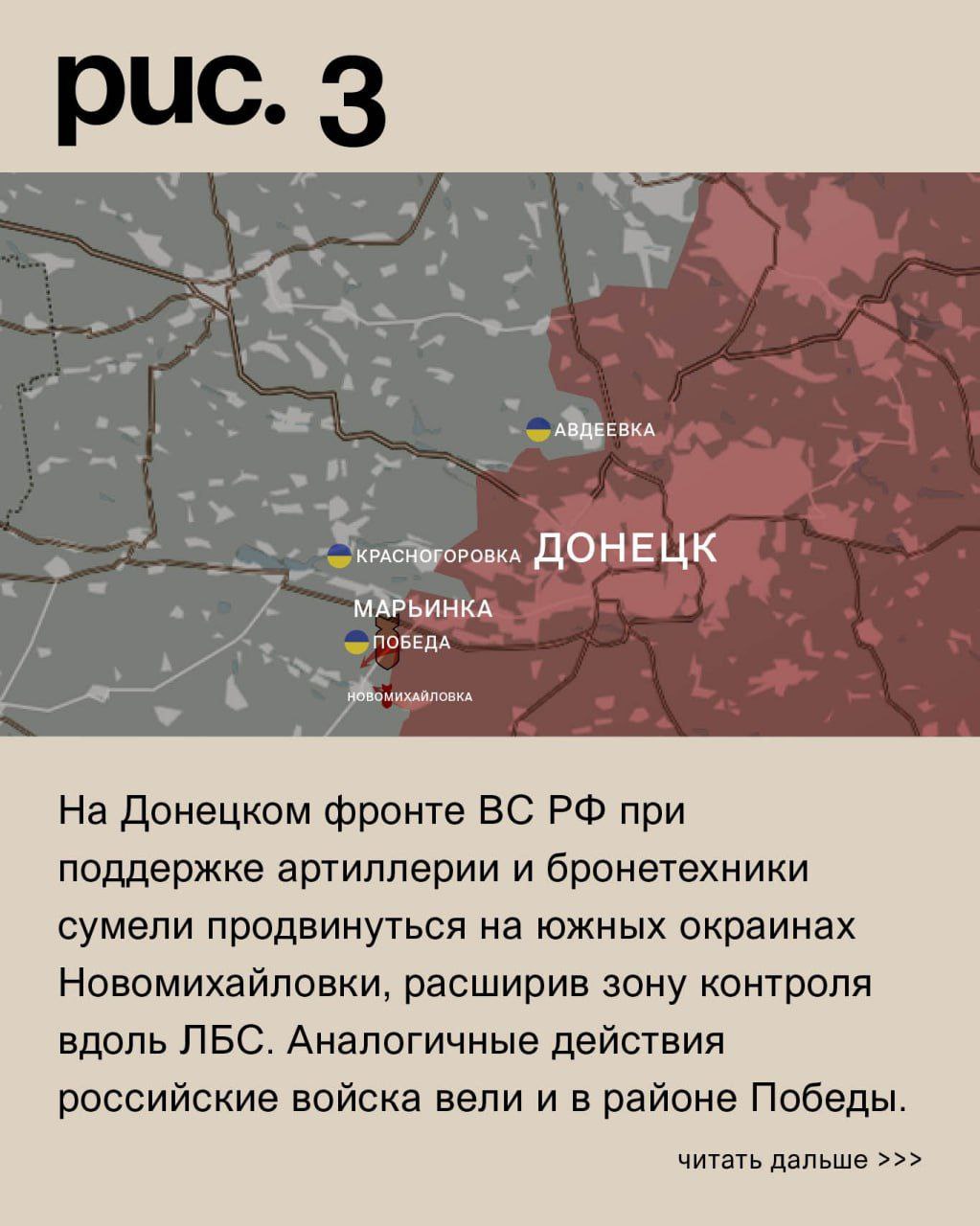 На Донецком фронте ВС РФ при поддержке артиллерии и бронетехники сумели продвинуться на южных окраинах Новомихайловки, расширив зону контроля вдоль ЛБС. Аналогичные действия российские войска вели и в районе Победы. Также штурмовые группы ВС РФ пытались продвинуться северо-западнее Марьинки. ВСУ удержали позиции. При поддержке средств дальнего поражения российские подразделения продолжили наступление на Авдеевку с юго-востока от промзоны и с северо-востока в районе коксохимического завода. ЛБС существенно не изменилась. После артобстрелов ВС РФ сумели выбить украинские войска с ряда позиций у Новокалинова. Под ударами ВСУ в Георгиевке, Курахове, городе Красногоровка, Нетайлове, Яснобродовке, Ласточкине, Бердычах, подконтрольной ВСУ Новобахмутовке (одноимённый пункт восточнее за ВС РФ), Нью-Йорке и Торецке. Российские позиции – в Славном, Марьинке, Старомихайловке, Донецке, Водяном и селе Красногоровка. (Рис.3)