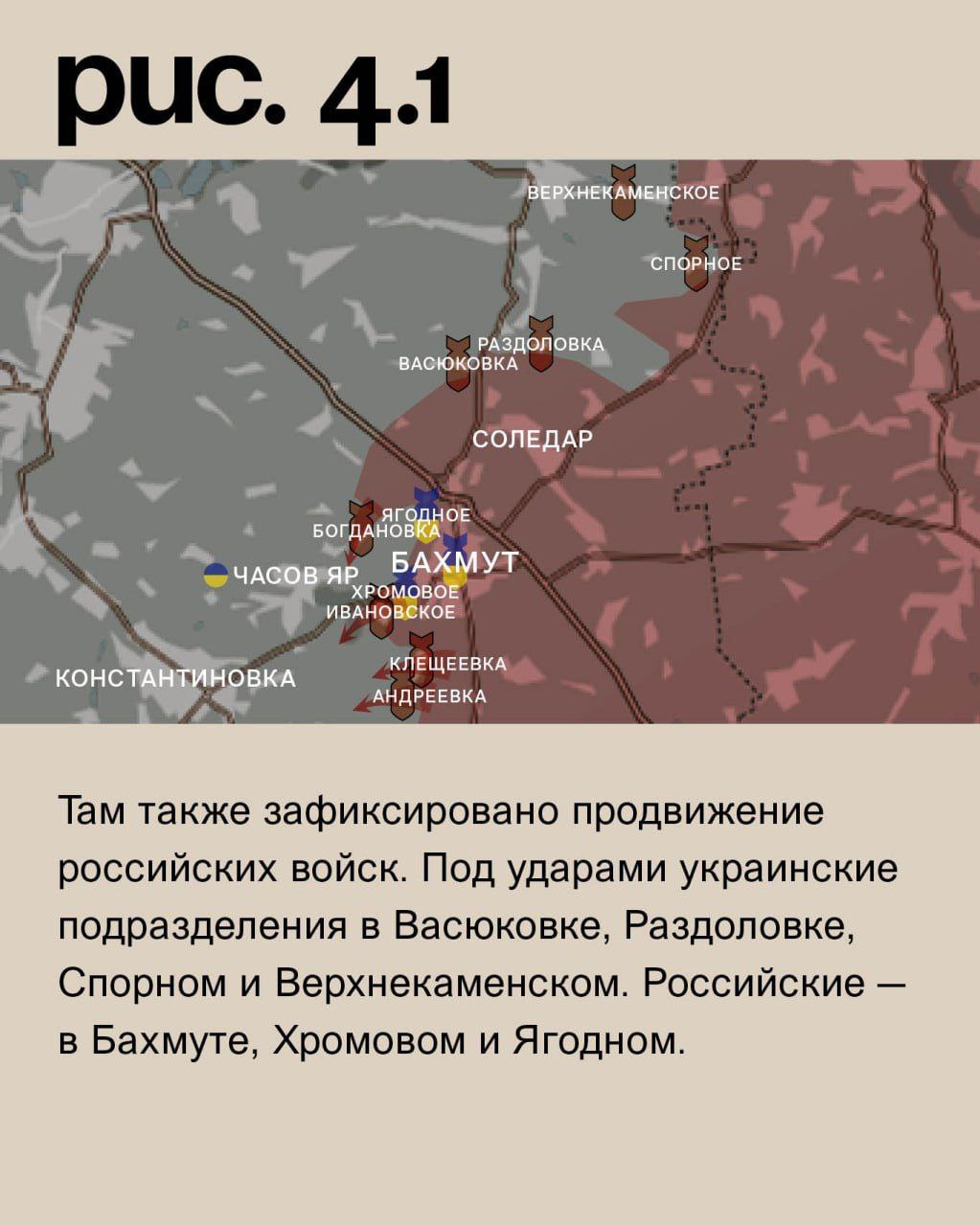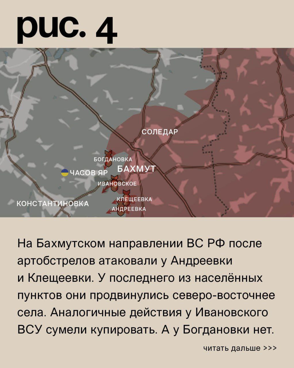 На Бахмутском направлении ВС РФ после артобстрелов атаковали у Андреевки и Клещеевки. У последнего из населённых пунктов они продвинулись северо-восточнее села. Аналогичные действия у Ивановского ВСУ сумели купировать. А у Богдановки нет. Там также зафиксировано продвижение российских войск. Под ударами украинские подразделения в Васюковке, Раздоловке, Спорном и Верхнекаменском. Российские – в Бахмуте, Хромовом и Ягодном. (Рис.4)
