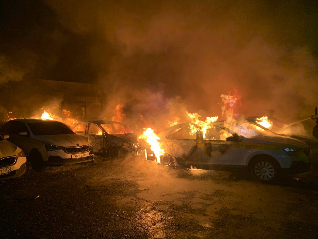 13 машин «Яндекс-Такси» сгорели сегодня ночью в подмосковном Акулово из-за короткого замыкания.