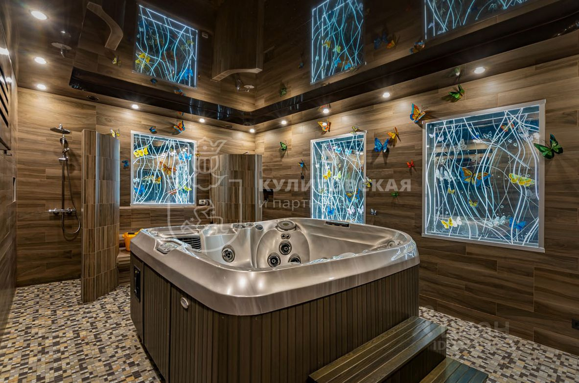 В отдельном доме на территории оборудованы сауна с душем, огромным джакузи и электрокамином с парогенератором.