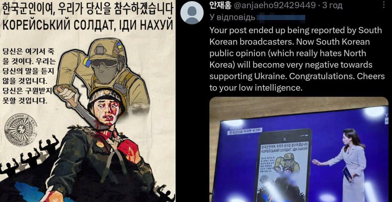 Украинцы создали "демотивирующий" плакат для солдат Северной Кореи с требованием "идти н***й" и всушником, перерезающим горло корейцу.